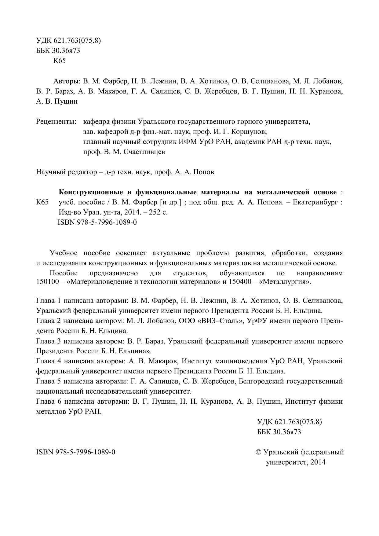 Учебное пособие освещает актуальные проблемы развития, обработки, создания и исследования конструкционных и функциональных материалов на металлической основе. Пособие предназначено для студентов, обучающихся по направлениям 150100 – «Материаловедение и технологии материалов» и 150400 – «Металлургия». Глава 1 написана авторами: В. М. Фарбер, Н. В. Лежнин, В. А. Хотинов, О. В. Селиванова, Уральский федеральный университет имени первого Президента России Б. Н. Ельцина. Глава 2 написана автором: М. Л. Лобанов, ООО «ВИЗ–Сталь», УрФУ имени первого Президента России Б. Н. Ельцина. Глава 3 написана автором: В. Р. Бараз, Уральский федеральный университет имени первого Президента России Б. Н. Ельцина». Глава 4 написана автором: А. В. Макаров, Институт машиноведения УрО РАН, Уральский федеральный университет имени первого Президента России Б. Н. Ельцина. Глава 5 написана авторами: Г. А. Салищев, С. В. Жеребцов, Белгородский государственный национальный исследовательский университет. Глава 6 написана авторами: В. Г. Пушин, Н. Н. Куранова, А. В. Пушин, Институт физики металлов УрО РАН.