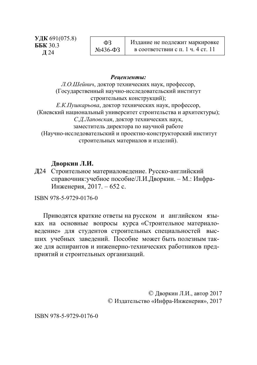 Приводятся краткие ответы на русском и английском языках на основные вопросы курса «Строительное материаловедение» для студентов строительных специальностей высших учебных заведений. Пособие может быть полезным также для аспирантов и инженерно-технических работников предприятий и строительных организаций.