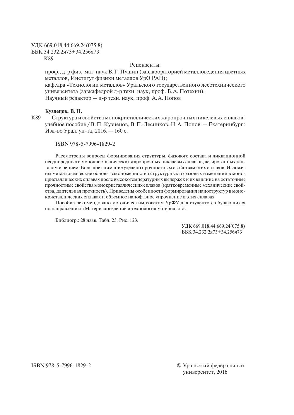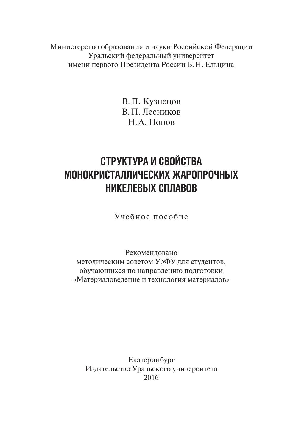 Рассмотрены вопросы формирования структуры, фазового состава и ликвационной неоднородности монокристаллических жаропрочных никелевых сплавов, легированных танталом и рением. Большое внимание уделено прочностным свойствам этих сплавов. Изложены металловедческие основы закономерностей структурных и фазовых изменений в монокристаллических сплавах после высокотемпературных выдержек и их влияние на остаточные прочностные свойства монокристаллических сплавов (кратковременные механические свойства, длительная прочность). Приведены особенности формирования наноструктур в монокристаллических сплавах и объемное нанофазное упрочнение в этих сплавах. Пособие рекомендовано методическим советом УрФУ для студентов, обучающихся по направлению «Материаловедение и технология материалов».