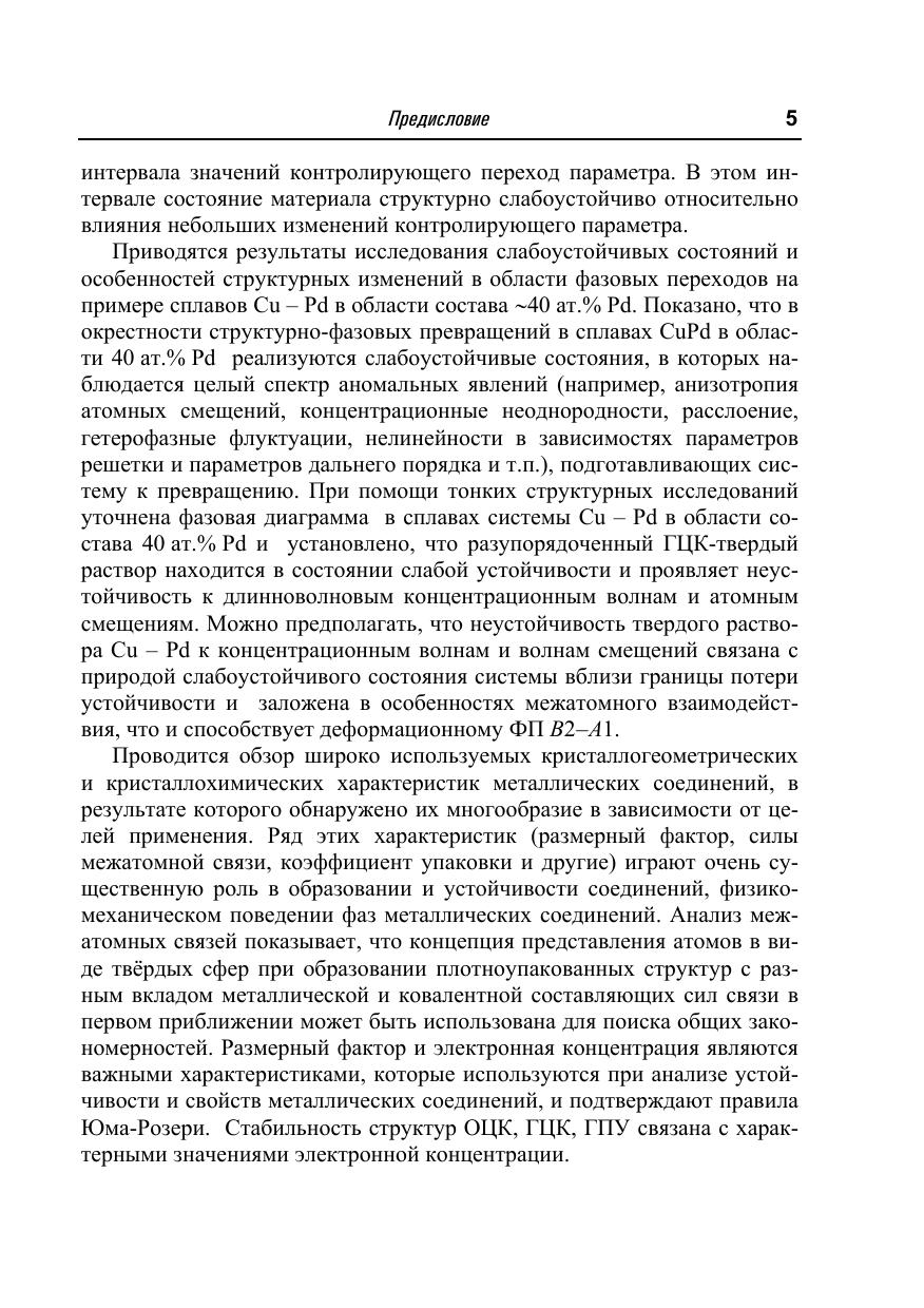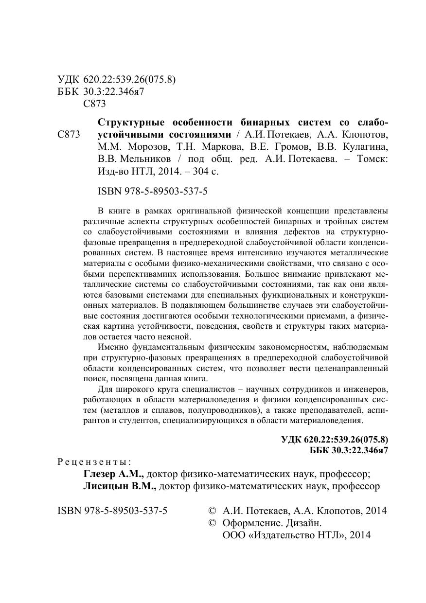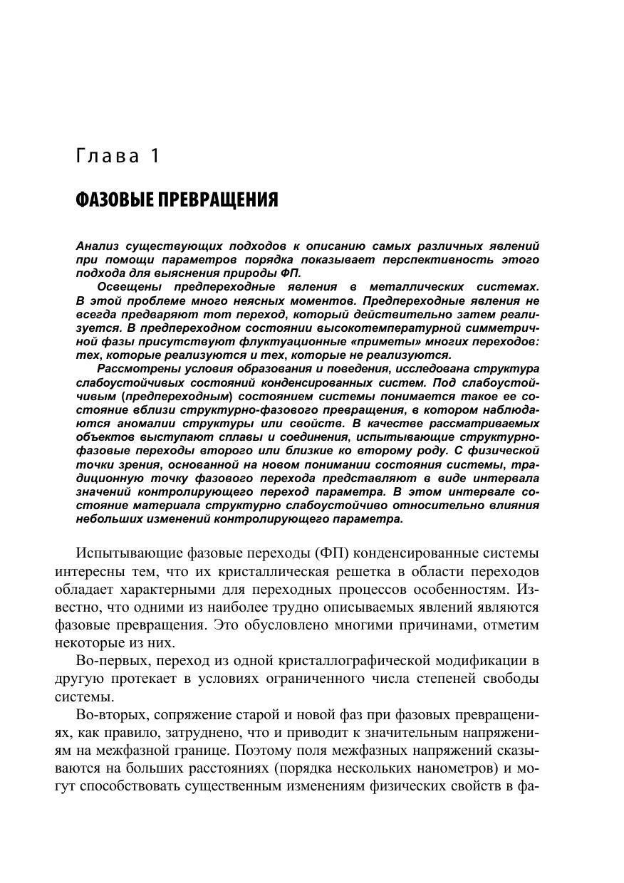 В книге в рамках оригинальной физической концепции представлены различные аспекты структурных особенностей бинарных и тройных систем со слабоустойчивыми состояниями и влияния дефектов на структурно-фазовые превращения в предпереходной слабоустойчивой области конденсированных систем. В настоящее время интенсивно изучаются металлические материалы с особыми физико-механическими свойствами, что связано с особыми перспективамиих использования. Большое внимание привлекают металлические системы со слабоустойчивыми состояниями, так как они являются базовыми системами для специальных функциональных и конструкционных материалов. В подавляющем большинстве случаев эти слабоустойчивые состояния достигаются особыми технологическими приемами, а физическая картина устойчивости, поведения, свойств и структуры таких материалов остается часто неясной. Именно фундаментальным физическим закономерностям, наблюдаемым при структурно-фазовых превращениях в предпереходной слабоустойчивой области конденсированных систем, что позволяет вести целенаправленный поиск, посвящена данная книга. Для широкого круга специалистов – научных сотрудников и инженеров, работающих в области материаловедения и физики конденсированных систем (металлов и сплавов, полупроводников), а также преподавателей, аспирантов и студентов, специализирующихся в области материаловедения.