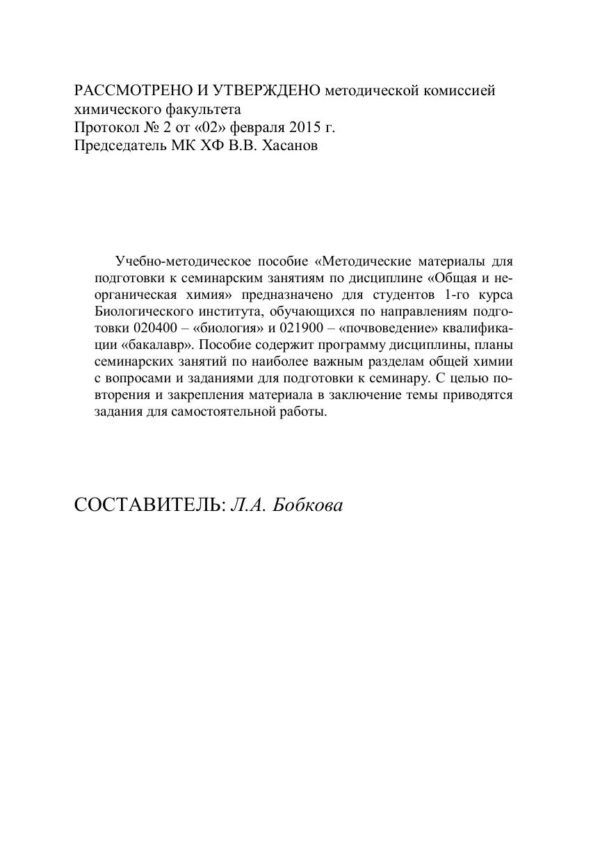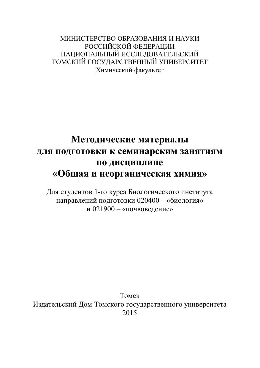 Учебно-методическое пособие «Методические материалы для подготовки к семинарским занятиям по дисциплине «Общая и неорганическая химия» предназначено для студентов 1-го курса Биологического института, обучающихся по направлениям подготовки 020400 – «биология» и 021900 – «почвоведение» квалификации «бакалавр». Пособие содержит программу дисциплины, планы семинарских занятий по наиболее важным разделам общей химии с вопросами и заданиями для подготовки к семинару. С целью повторения и закрепления материала в заключение темы приводятся задания для самостоятельной работы.
