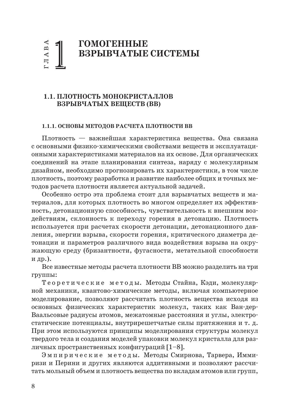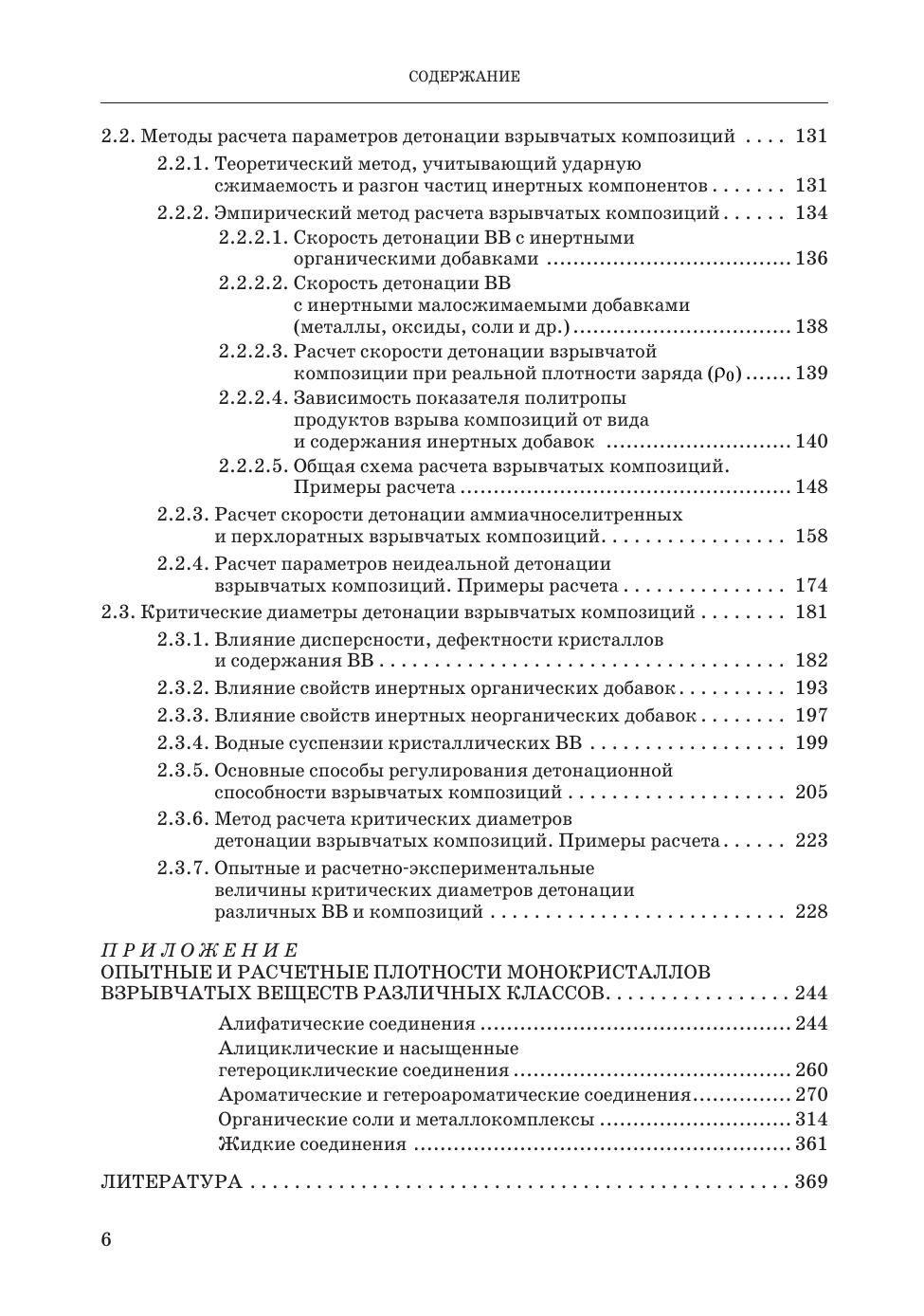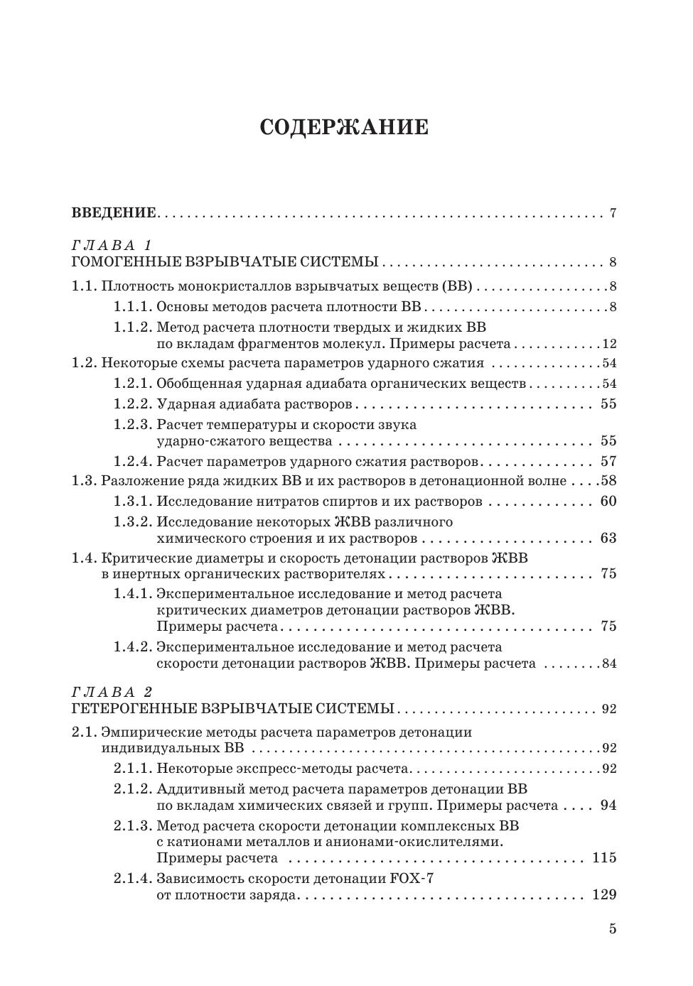 Рассмотрены эмпирические методы расчета параметров идеальной и неидеальной детонации взрывчатых композиций различного вида, плотности монокристаллов и скорости детонации индивидуальных ВВ, а также характеристик ударного сжатия ВВ и растворов ВВ. Даны подробные примеры расчета. Большинство изложенных методов разработано авторами на кафедре химии и технологии органических соединений азота Санкт-Петербургского государственного технологического института (технического университета) и в СКТБ «Технолог». Книга предназначена для научных сотрудников и специалистов, занимающихся разработкой взрывчатых композиций различного назначения и их использованием в разных областях. Кроме того, она может быть полезна для подготовки специалистов по специальности «Химическая технология энергонасыщенных материалов и изделий», а также аспирантов по специальности «Химическая технология топлива и высокоэнергетических веществ».