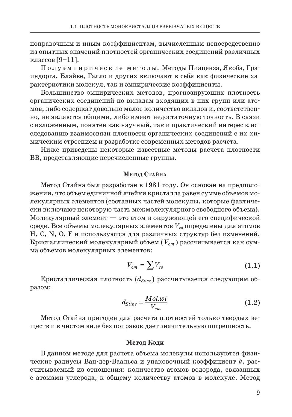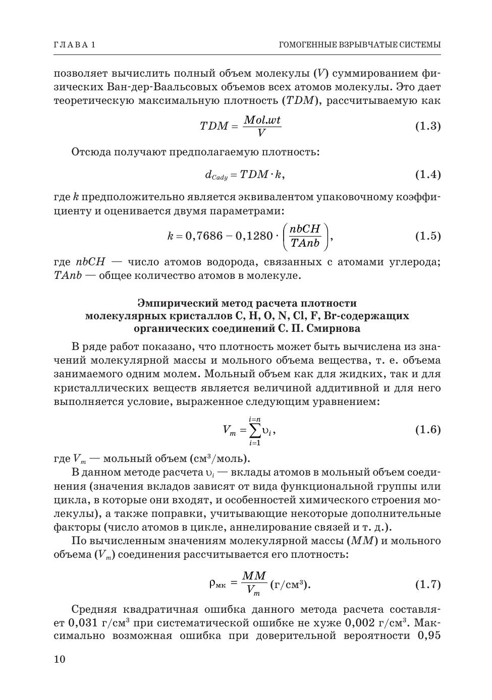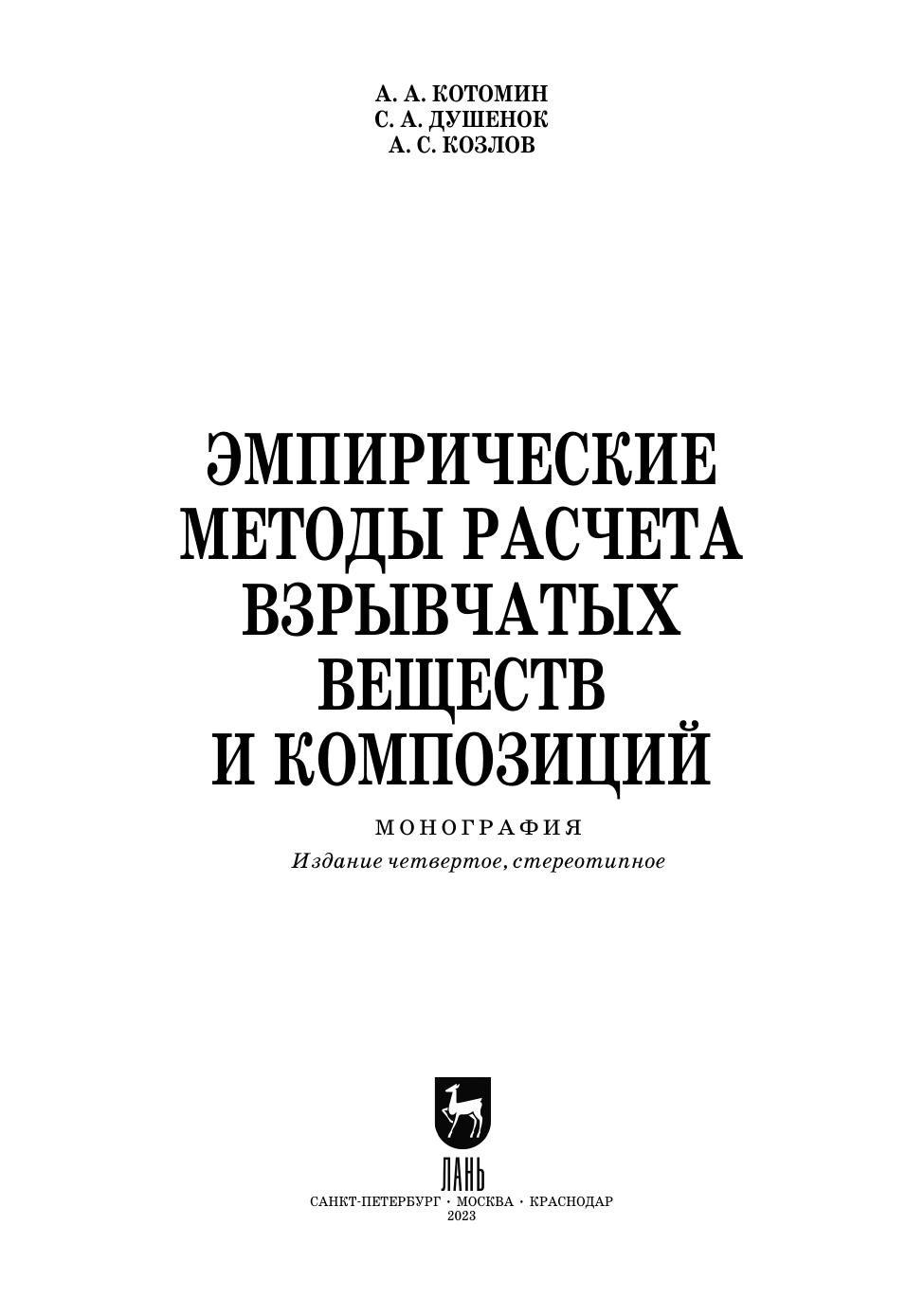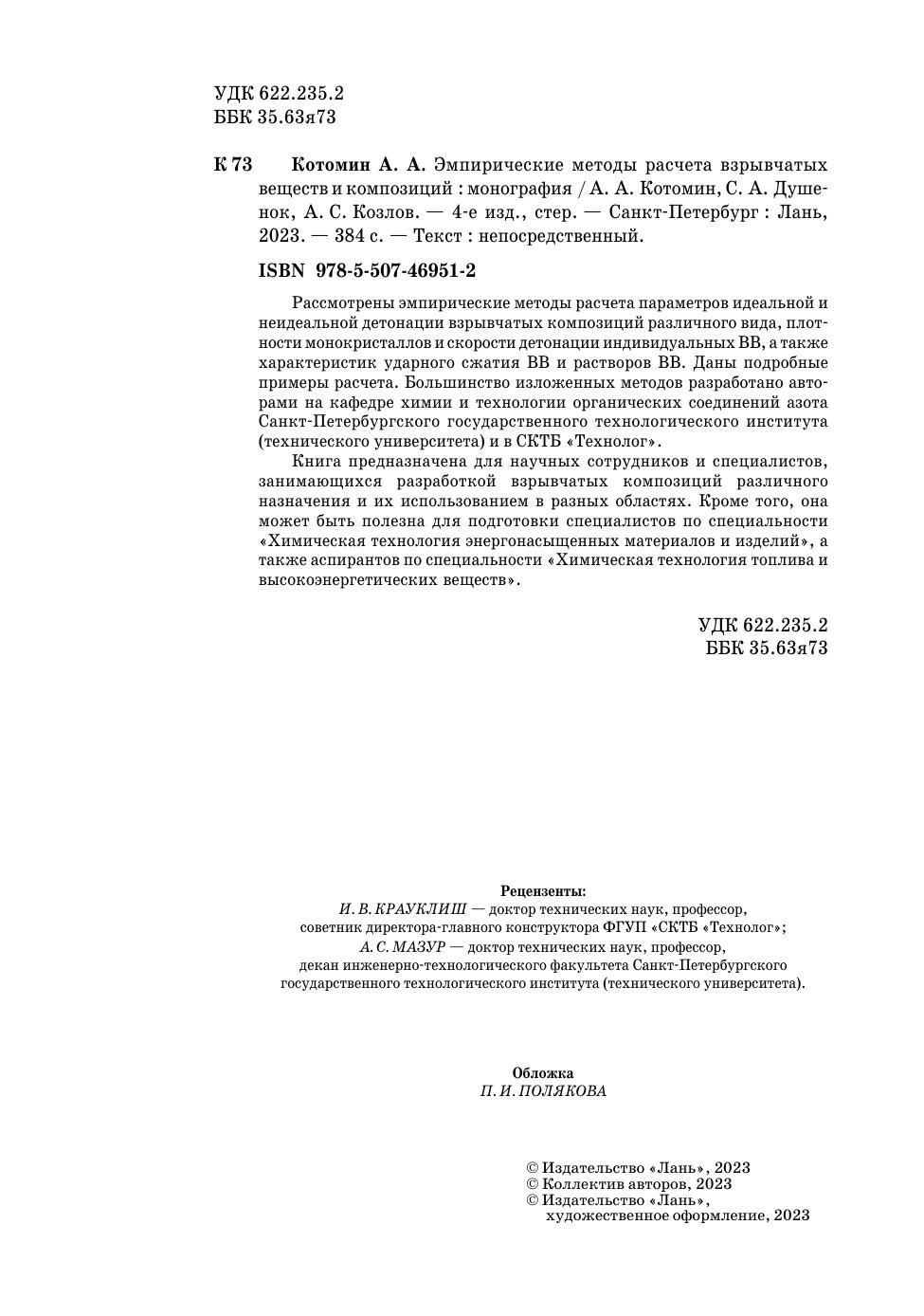 Рассмотрены эмпирические методы расчета параметров идеальной и неидеальной детонации взрывчатых композиций различного вида, плотности монокристаллов и скорости детонации индивидуальных ВВ, а также характеристик ударного сжатия ВВ и растворов ВВ. Даны подробные примеры расчета. Большинство изложенных методов разработано авторами на кафедре химии и технологии органических соединений азота Санкт-Петербургского государственного технологического института (технического университета) и в СКТБ «Технолог». Книга предназначена для научных сотрудников и специалистов, занимающихся разработкой взрывчатых композиций различного назначения и их использованием в разных областях. Кроме того, она может быть полезна для подготовки специалистов по специальности «Химическая технология энергонасыщенных материалов и изделий», а также аспирантов по специальности «Химическая технология топлива и высокоэнергетических веществ».