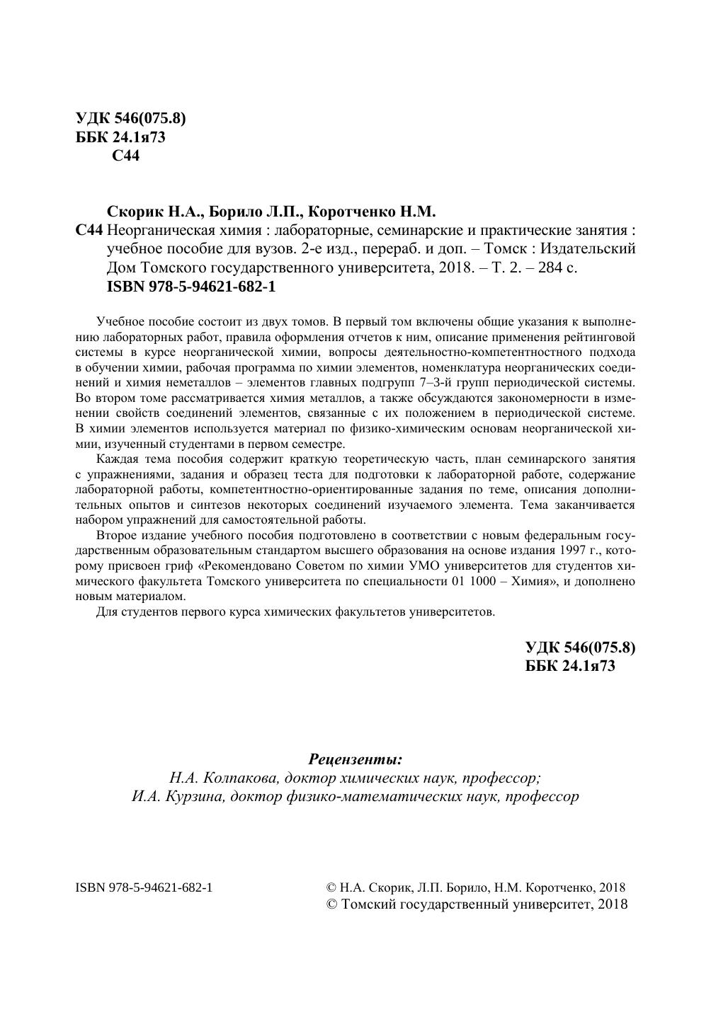 Учебное пособие состоит из двух томов. В первый том включены общие указания к выполнению лабораторных работ, правила оформления отчетов к ним, описание применения рейтинговой системы в курсе неорганической химии, вопросы деятельностно-компетентностного подхода в обучении химии, рабочая программа по химии элементов, номенклатура неорганических соединений и химия неметаллов ‒ элементов главных подгрупп 7–3-й групп периодической системы. Во втором томе рассматривается химия металлов, а также обсуждаются закономерности в изменении свойств соединений элементов, связанные с их положением в периодической системе. В химии элементов используется материал по физико-химическим основам неорганической химии, изученный студентами в первом семестре. Каждая тема пособия содержит краткую теоретическую часть, план семинарского занятия с упражнениями, задания и образец теста для подготовки к лабораторной работе, содержание лабораторной работы, компетентностно-ориентированные задания по теме, описания дополнительных опытов и синтезов некоторых соединений изучаемого элемента. Тема заканчивается набором упражнений для самостоятельной работы. Второе издание учебного пособия подготовлено в соответствии с новым федеральным государственным образовательным стандартом высшего образования на основе издания 1997 г., которому присвоен гриф «Рекомендовано Советом по химии УМО университетов для студентов химического факультета Томского университета по специальности 01 1000 ‒ Химия», и дополнено новым материалом. Для студентов первого курса химических факультетов университетов.