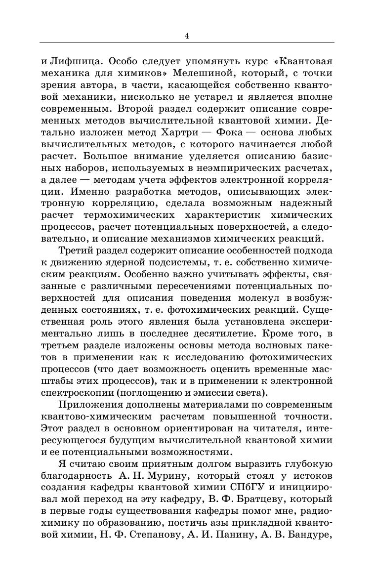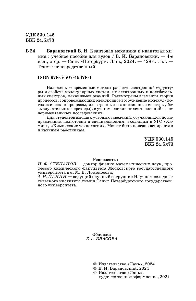Изложены современные методы расчета электронной структуры и свойств молекулярных систем, их электронных и колебательных спектров, механизмов реакций. Рассмотрены элементы теории процессов, сопровождающих электронное возбуждение молекул (фотохимические процессы, электронные и эмиссионные спектры, безызлучательные переходы), с учетом сложившихся тенденций в экспериментальных исследованиях. Для студентов высших учебных заведений, обучающихся направлениям подготовки и специальностям, входящим в УГС «Химия», «Химические технологии». Может быть полезно аспирантам и научным работникам.