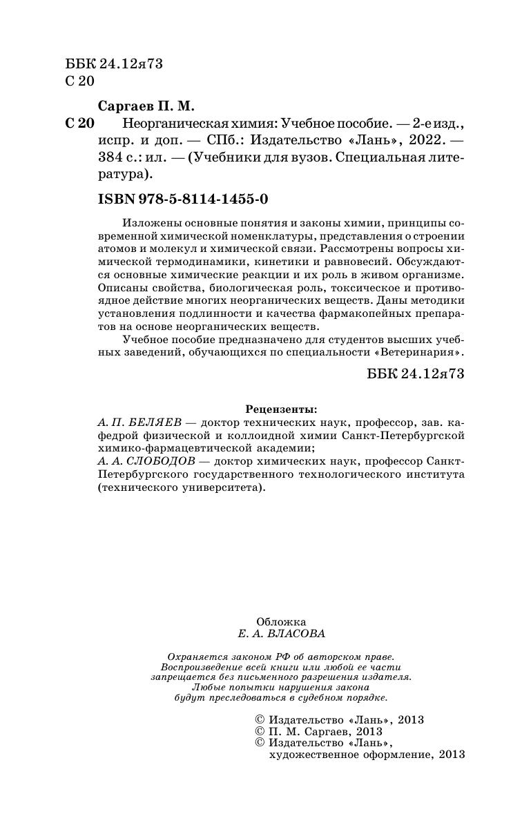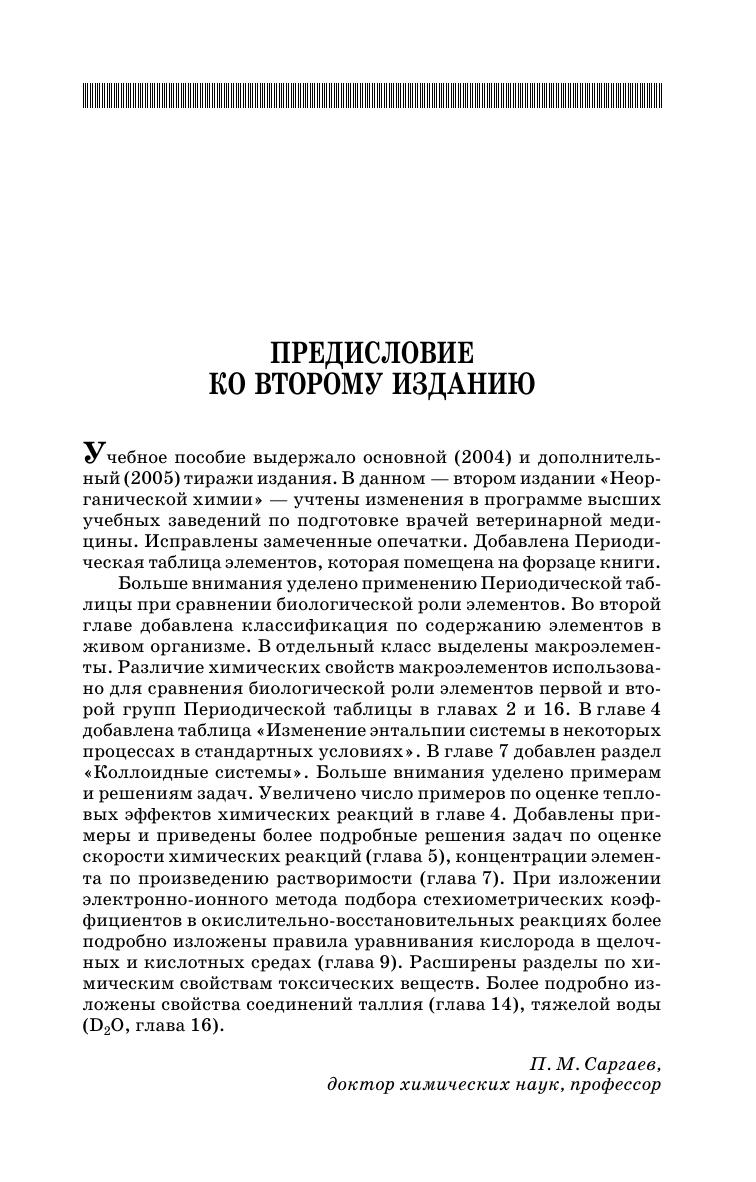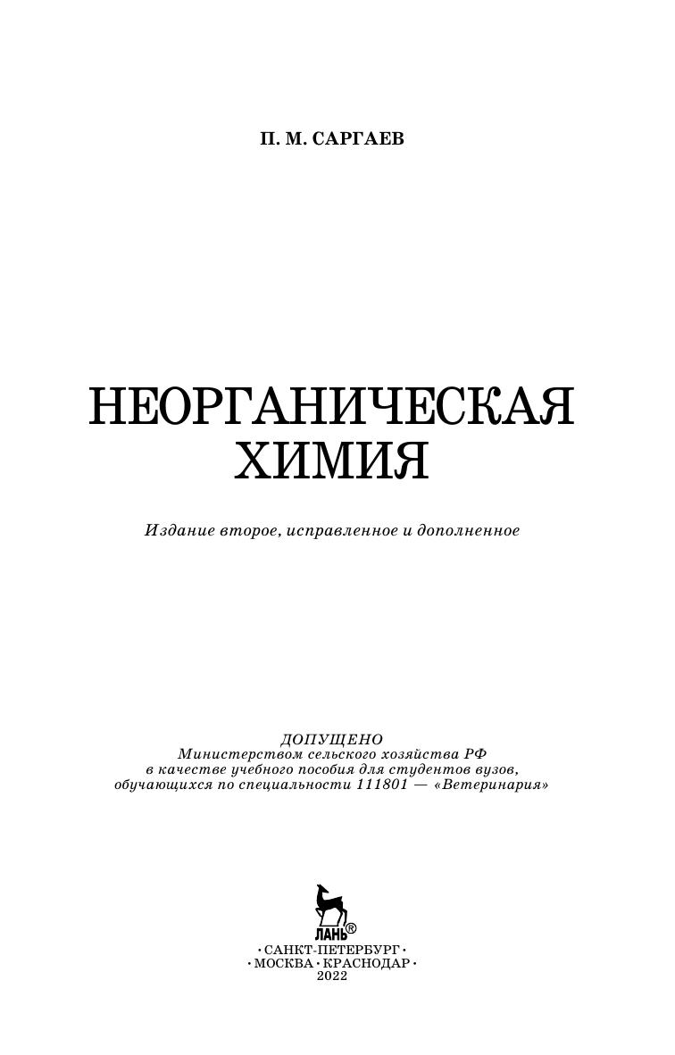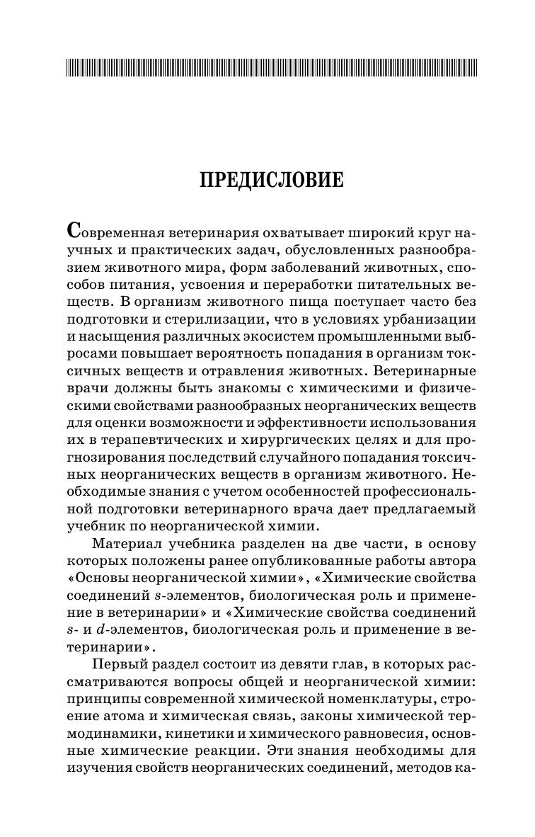 Изложены основные понятия и законы химии, принципы современной химической номенклатуры, представления о строении атомов и молекул и химической связи. Рассмотрены вопросы химической термодинамики, кинетики и равновесий. Обсуждаются основные химические реакции и их роль в живом организме. Описаны свойства, биологическая роль, токсическое и противоядное действие многих неорганических веществ. Даны методики установления подлинности и качества фармакопейных препаратов на основе неорганических веществ. Учебник предназначен для студентов высших учебных заведений, обучающихся по специальности 111801 — «Ветеринария».