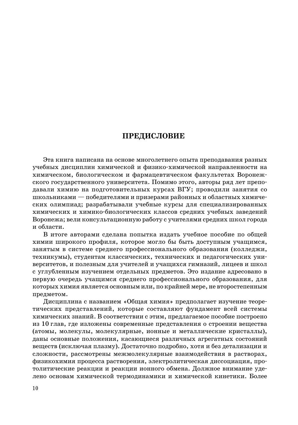 В доступной форме рассмотрены современные представления о строении атомов и молекул, о свойствах растворов неэлектролитов и электролитов, изложены основные разделы теории химических процессов (термохимия, химическое равновесие, кинетика). Подробнее, чем в учебниках по общей и неорганической химии, даны основы электрохимической термодинамики и их приложения к вопросам термодинамической устойчивости металлов в агрессивных средах и устойчивости водных растворов. Кратко, на современном научном уровне представлены основы физико-химического анализа и особенности гетерогенных равновесий в однокомпонентных и двухкомпонентных системах. Изложение многих вопросов дополнено решением задач разного уровня сложности.