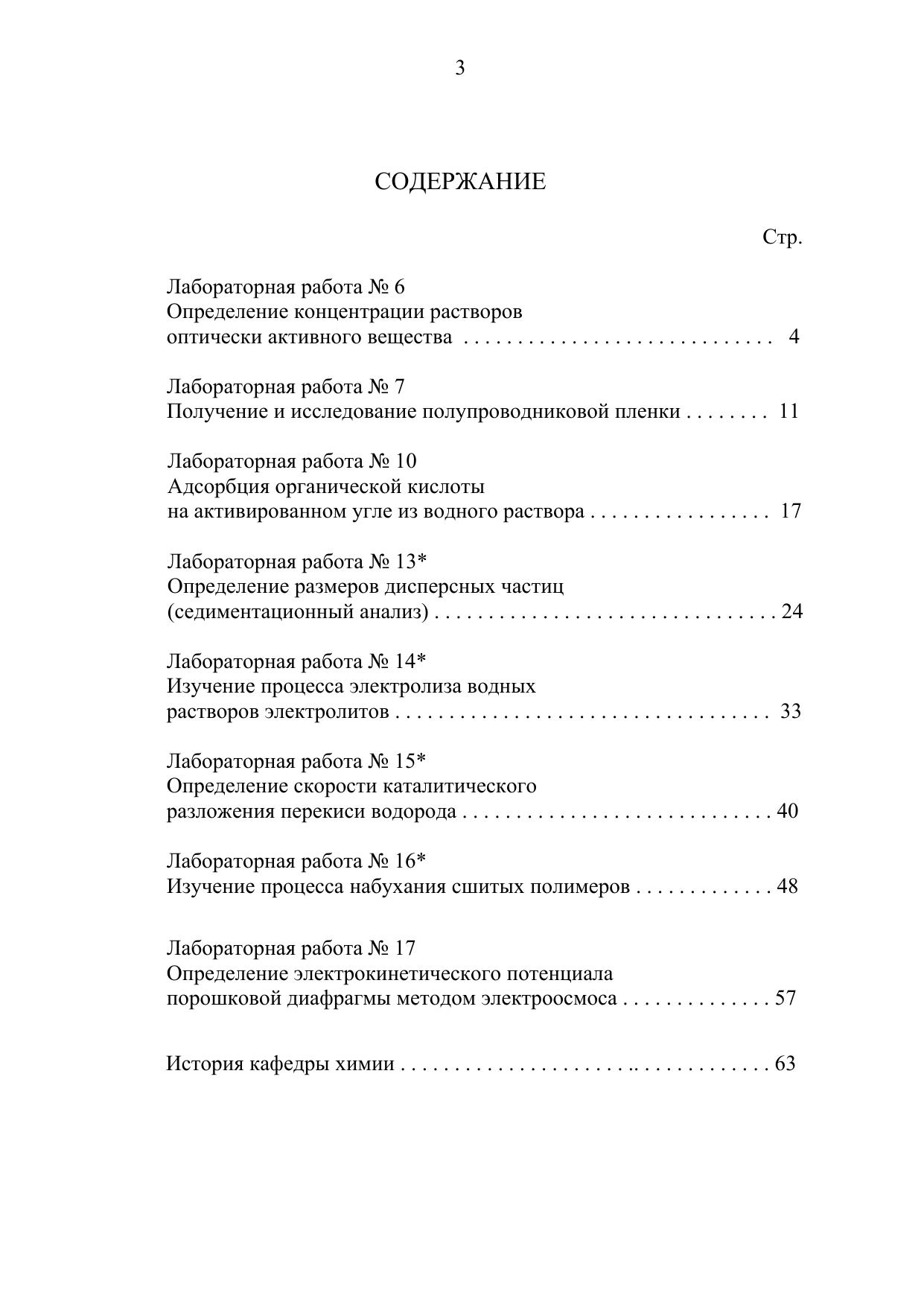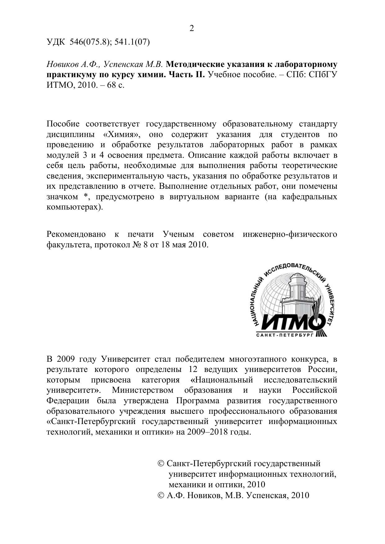 Пособие соответствует государственному образовательному стандарту дисциплины «Химия», оно содержит указания для студентов по проведению и обработке результатов лабораторных работ в рамках модулей 3 и 4 освоения предмета. Описание каждой работы включает в себя цель работы, необходимые для выполнения работы теоретические сведения, экспериментальную часть, указания по обработке результатов и их представлению в отчете. Выполнение отдельных работ, они помеченызначком *, предусмотрено в виртуальном варианте (на кафедральных компьютерах).