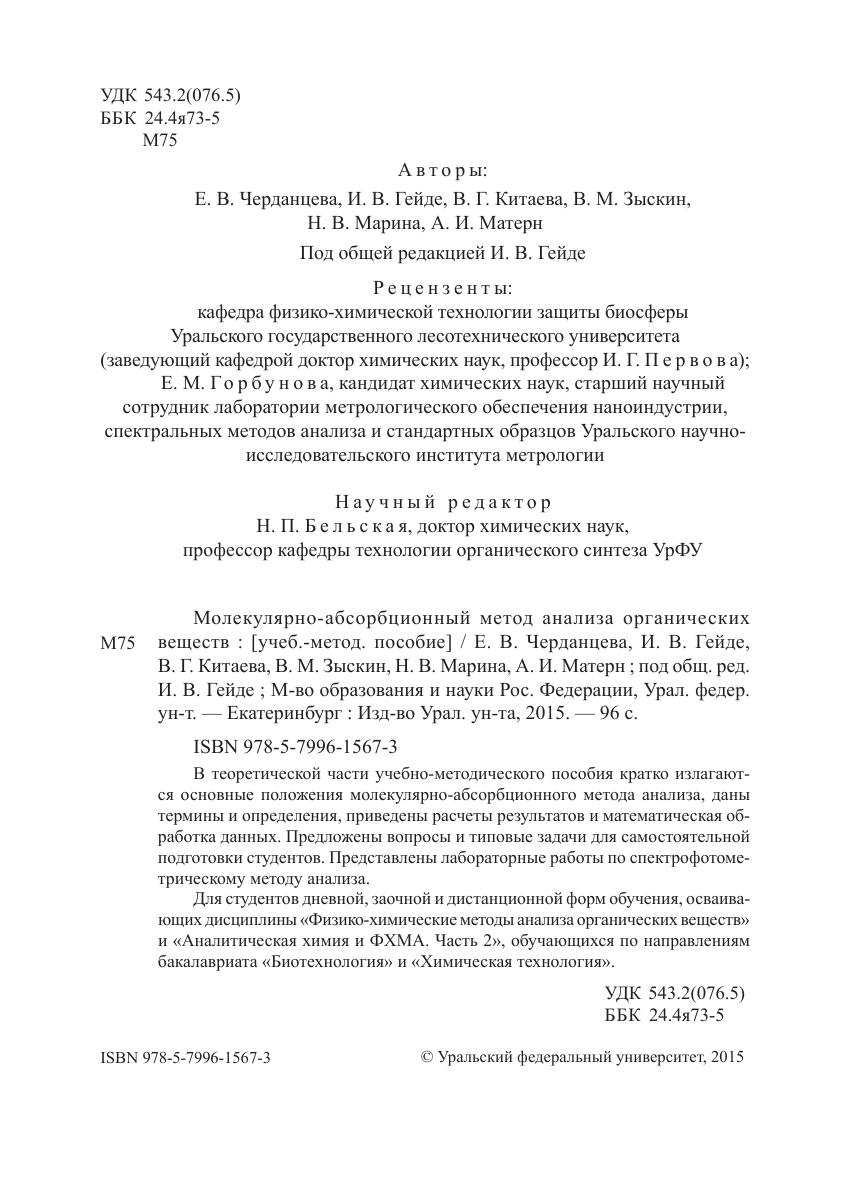 В теоретической части учебно-методического пособия кратко излагаются основные положения молекулярно-абсорбционного метода анализа, даны термины и определения, приведены расчеты результатов и математическая обработка данных. Предложены вопросы и типовые задачи для самостоятельной подготовки студентов. Представлены лабораторные работы по спектрофотометрическому методу анализа. Для студентов дневной, заочной и дистанционной форм обучения, осваивающих дисциплины «Физико-химические методы анализа органических веществ» и «Аналитическая химия и ФХМА. Часть 2», обучающихся по направлениям бакалавриата «Биотехнология» и «Химическая технология».