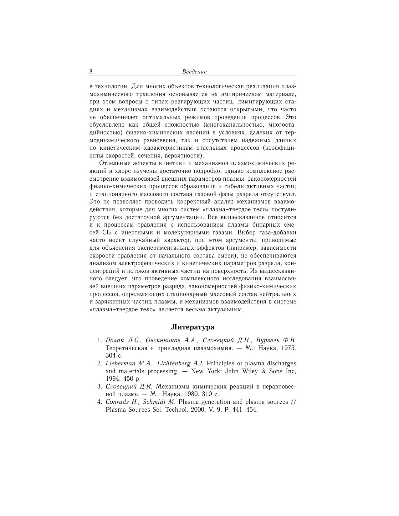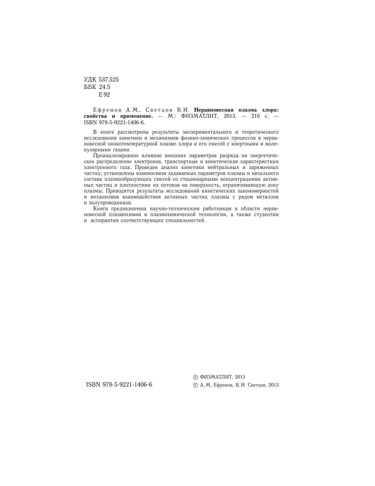 В книге рассмотрены результаты экспериментального и теоретического исследования кинетики и механизмов физико-химических процессов в неравновесной низкотемпературной плазме хлора и его смесей с инертными и молекулярными газами.Проанализировано влияние внешних параметров разряда на энергетическое распределение электронов, транспортные и кинетические характеристики электронного газа. Проведен анализ кинетики нейтральных и заряженных частиц установлены взаимосвязи задаваемых параметров плазмы и начального состава плазмообразующих смесей со стационарными концентрациями активных частиц и плотностями их потоков на поверхность, ограничивающую зону плазмы. Приводятся результаты исследований кинетических закономерностей и механизмов взаимодействия активных частиц плазмы с рядом металлов и полупроводников. Книга предназначена научно-техническим работникам в области неравновесной плазмохимии и плазмохимической технологии, а также студентам и аспирантам соответствующих специальностей.