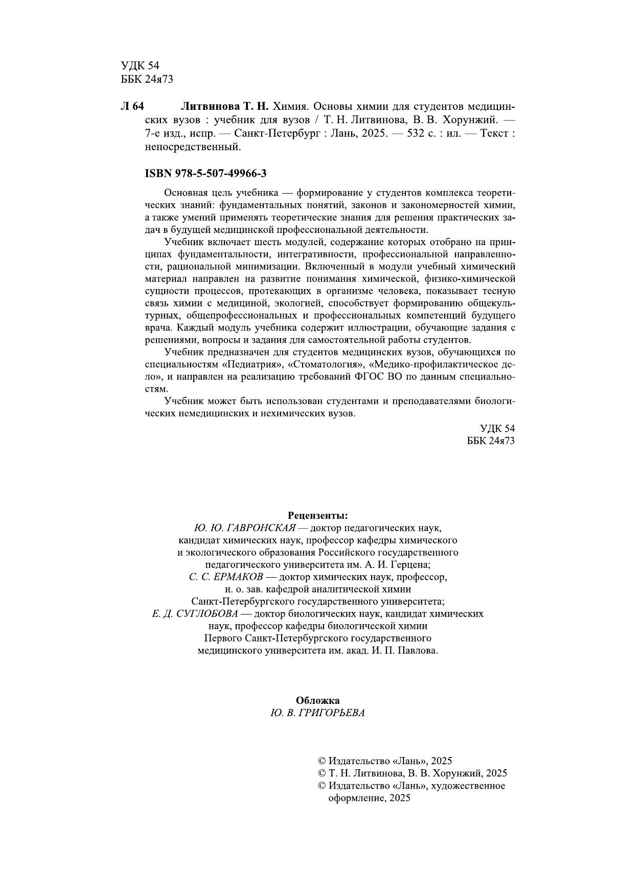 Основная цель учебника — формирование у студентов комплекса теоретических знаний: фундаментальных понятий, законов и закономерностей химии, а также умений применять теоретические знания для решения практических задач в будущей медицинской профессиональной деятельности. Учебник включает шесть модулей, содержание которых отобрано на принципах фундаментальности, интегративности, профессиональной направленности, рациональной минимизации. Включенный в модули учебный химический материал направлен на развитие понимания химической, физико-химической сущности процессов, протекающих в организме человека, показывает тесную связь химии с медициной, экологией, способствует формированию общекультурных, общепрофессиональных и профессиональных компетенций будущего врача. Каждый модуль учебника содержит иллюстрации, обучающие задания с решениями, вопросы и задания для самостоятельной работы студентов. Учебник предназначен для студентов медицинских вузов, обучающихся по специальностям «Педиатрия», «Стоматология», «Медико-профилактическое дело», и направлен на реализацию требований ФГОС ВО по данным специальностям. Учебник может быть использован студентами и преподавателями биологических немедицинских и нехимических вузов.