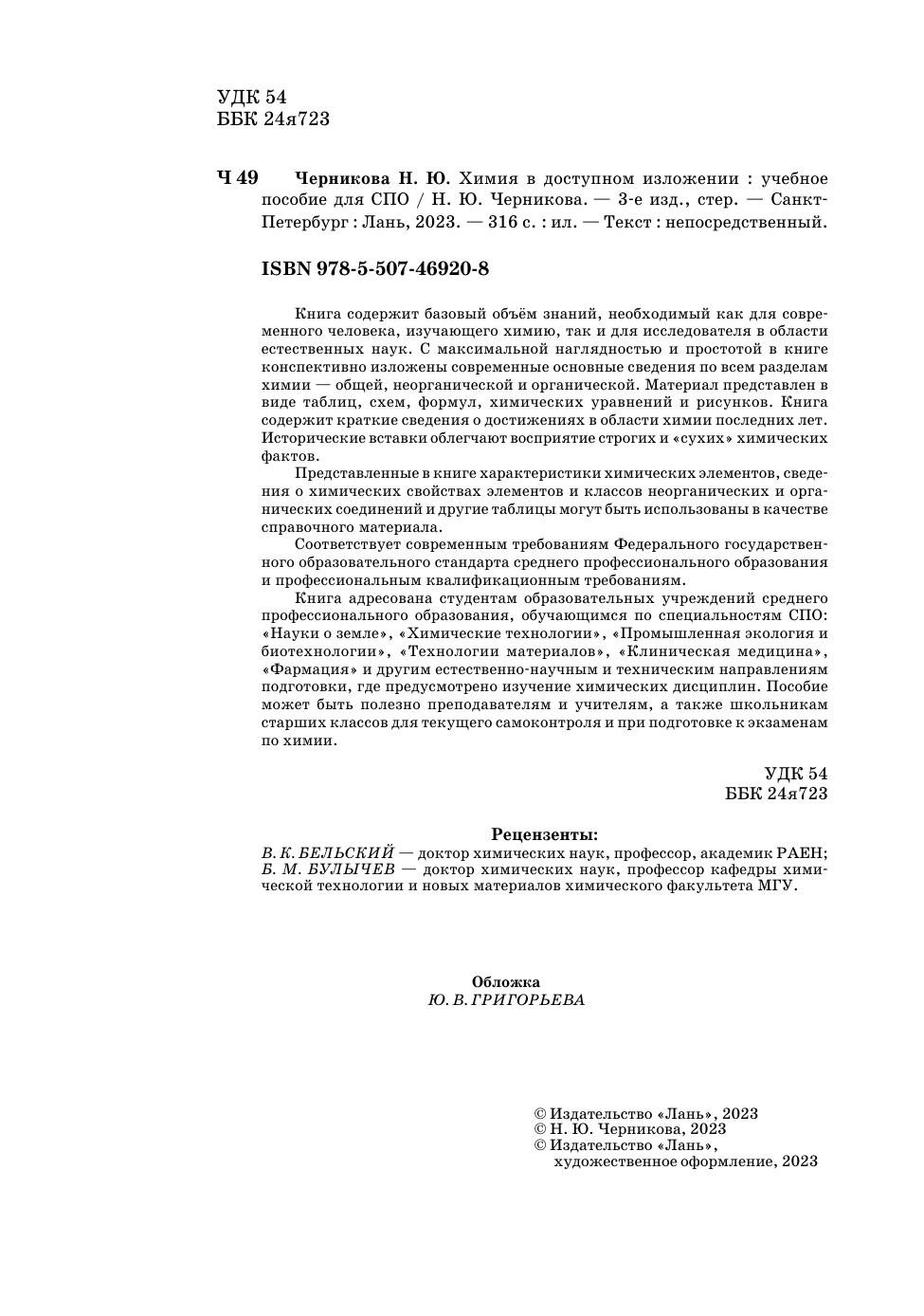 Книга содержит базовый объём знаний, необходимый для современного человека — как изучающего химию, так и для исследователя в области естественных наук. С максимальной наглядностью и простотой в книге конспективно изложены современные основные сведения по всем разделам химии — общей, неорганической и органической. Материал представлен в виде таблиц, схем, формул, химических уравнений и рисунков. Книга содержит краткие сведения о достижениях в области химии последних лет. Исторические вставки облегчают восприятие строгих и «сухих» химических фактов. Представленные в книге характеристики химических элементов, сведения о химических свойствах элементов и классов неорганических и органических соединений, другие таблицы могут быть использованы в качестве справочного материала. Соответствует современным требованиям Федерального государственного образовательного стандарта среднего профессионального образования и профессиональным квалификационным требованиям. Книга адресована студентам образовательных учреждений среднего профессионального образования, обучающихся по специальностям СПО: «Науки о земле», «Химические технологии», «Промышленная экология и биотехнологии», «Технологии материалов», «Клиническая медицина», «Фармация» и другим естественнонаучным и техническим направлениям подготовки, где предусмотрено изучение химических дисциплин. Пособие может быть полезно преподавателям и учителям, а также школьникам старших классов для текущего самоконтроля и при подготовке к экзаменам по химии.