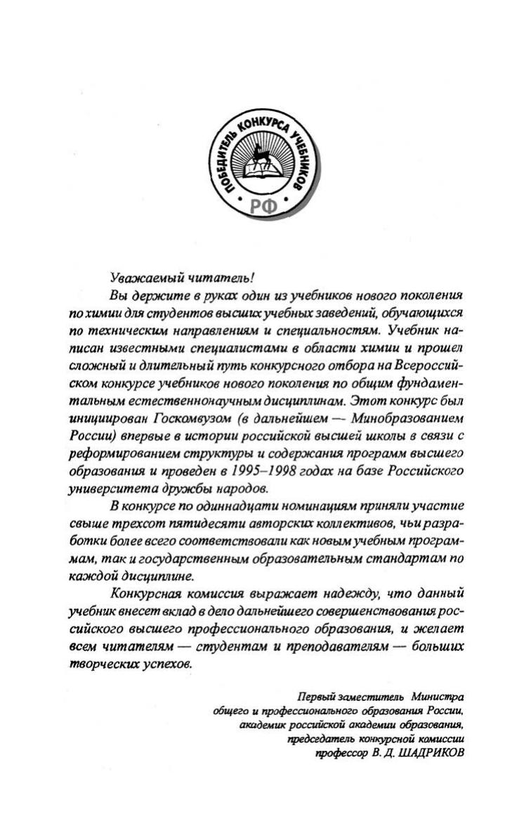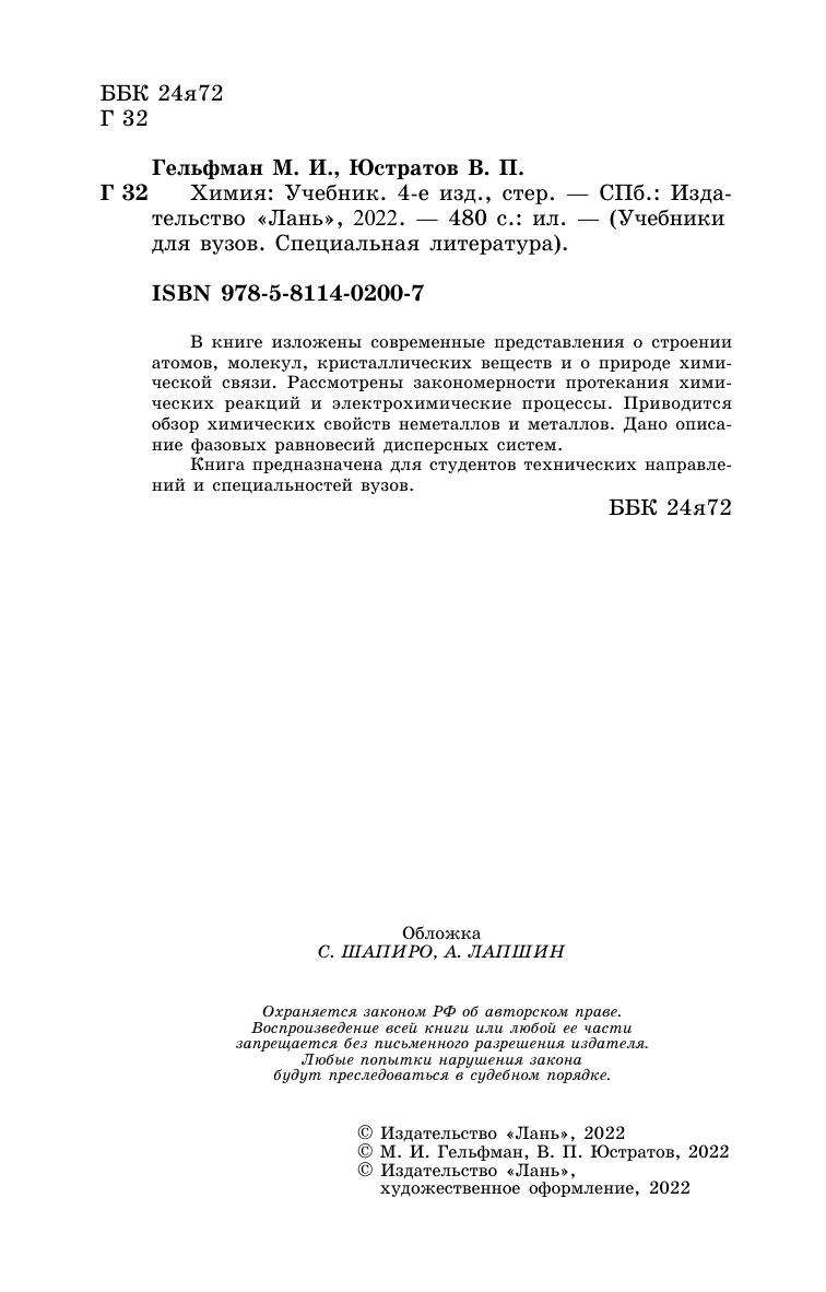 В книге изложены современные представления о строении атомов, молекул, кристаллических веществ и о природе химической связи. Рассмотрены закономерности протекания химических реакций и электрохимические процессы. Приводится обзор химических свойств неметаллов и металлов. Дано описание фазовых равновесий и дисперсных систем. Книга предназначена для студентов технических направлений и специальностей вузов.