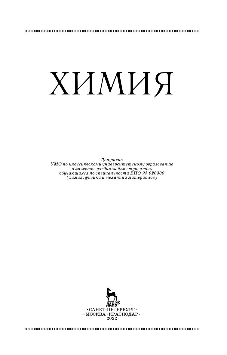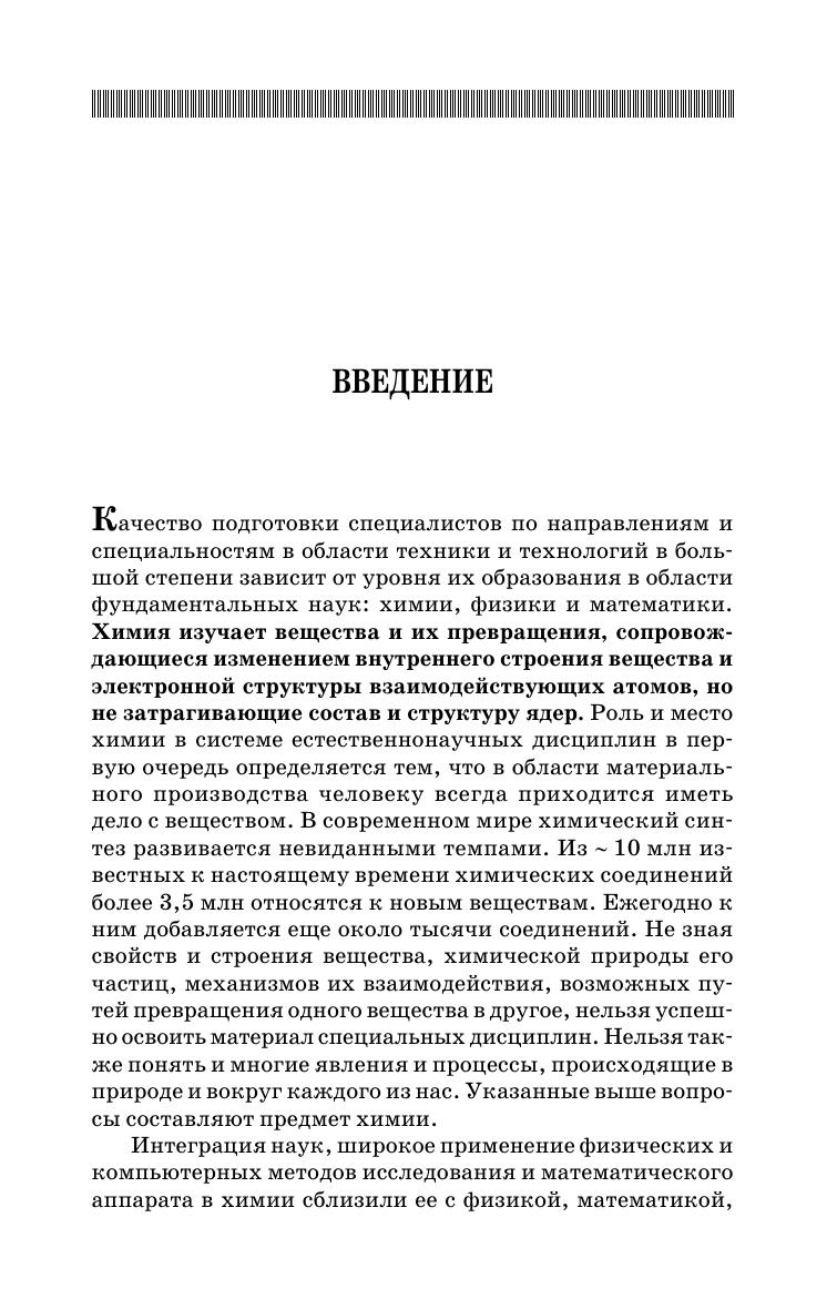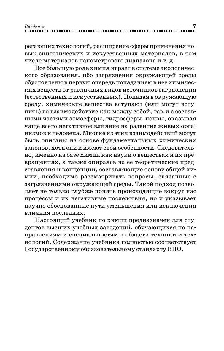 В учебнике на основе современных химических знаний представлено изложение курса химии с учетом логики дисциплины и всех требований по её усвоению. Текстовой материал дополнен необходимыми иллюстрациями и справочными материалами. Предназначен студентам высших учебных заведений, обучающихся по направлениям подготовки и специальностям в области техники и технологий. Содержание учебника полностью соответствует Государственному образовательному стандарту ВПО.