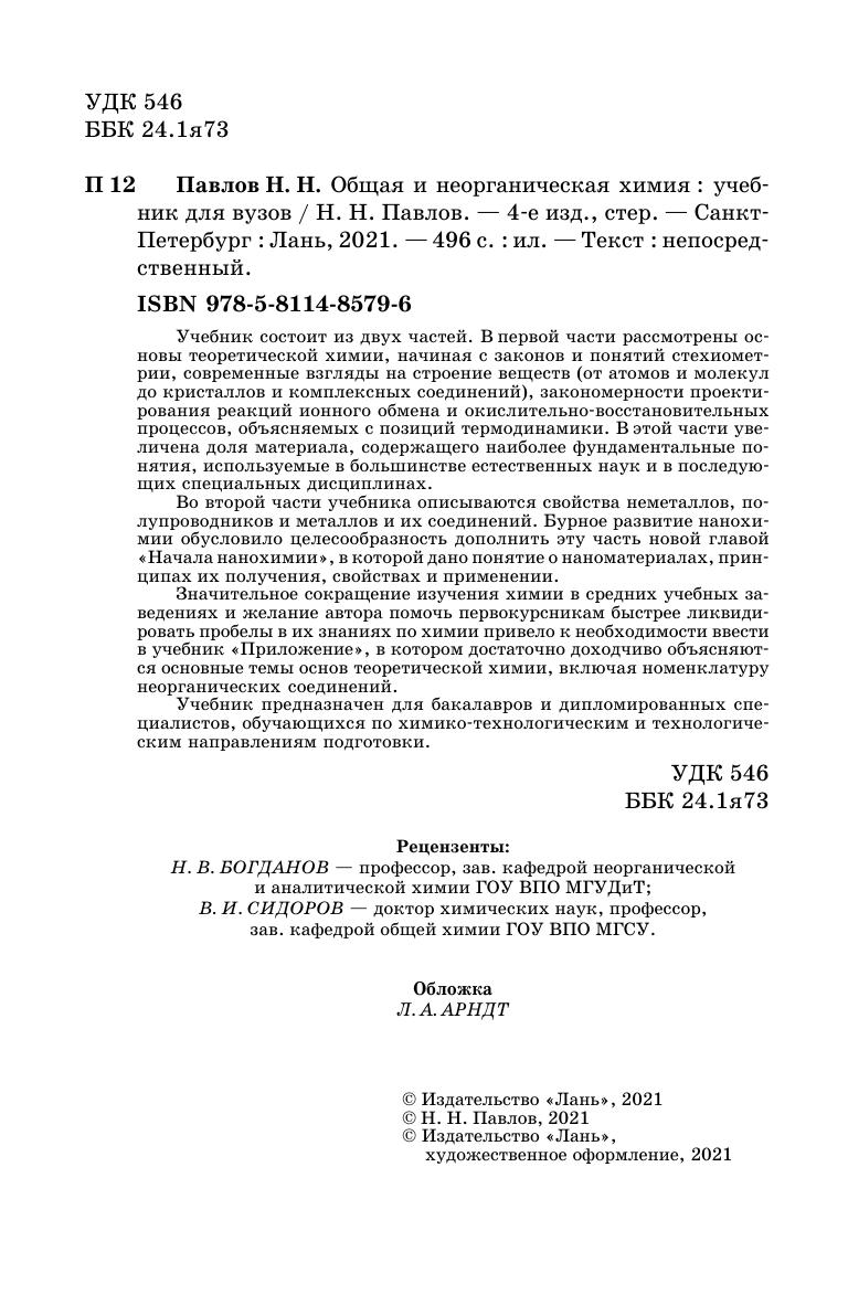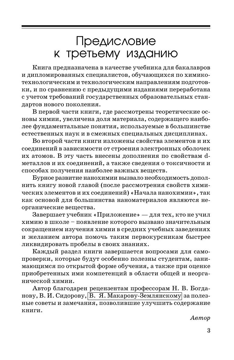 Учебник состоит из двух частей. В первой части рассмотрены основы теоретической химии, начиная с законов и понятий стехиометрии, современные взгляды на строение веществ (от атомов и молекул до кристаллов и комплексных соединений), закономерности проектирования реакций ионного обмена и окислительно-восстановительных процессов, объясняемых с позиций термодинамики. В этой части увеличена доля материала, содержащего наиболее фундаментальные понятия, используемые в большинстве естественных наук и в последующих специальных дисциплинах.