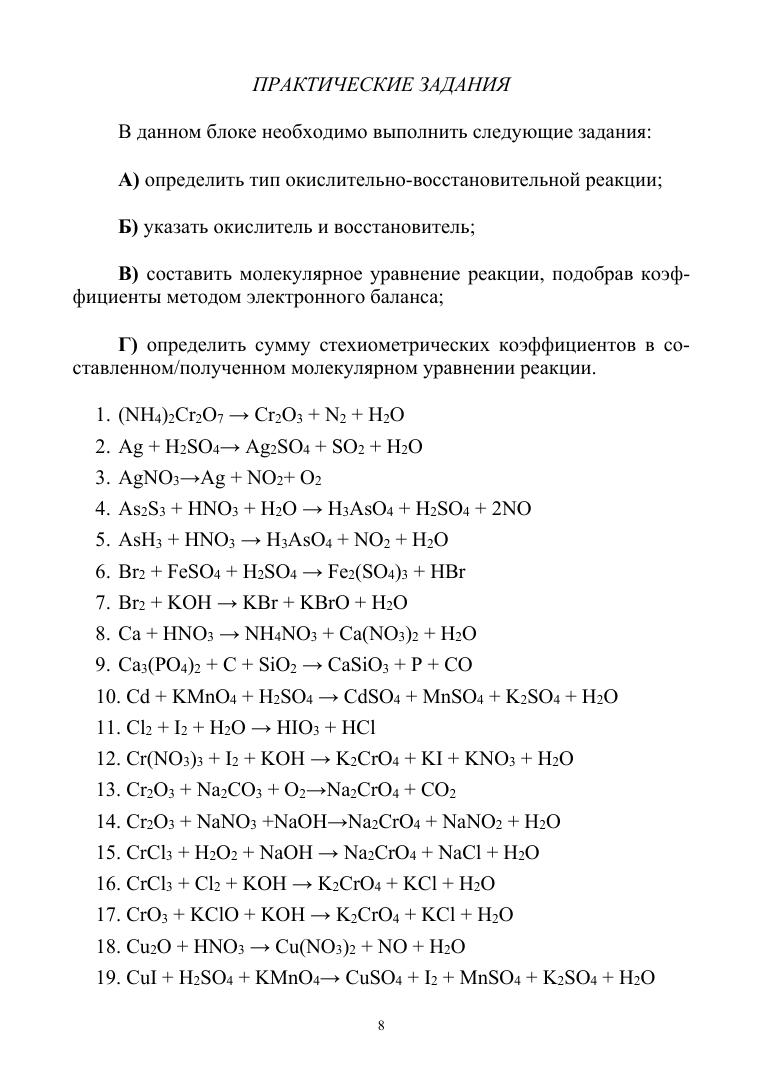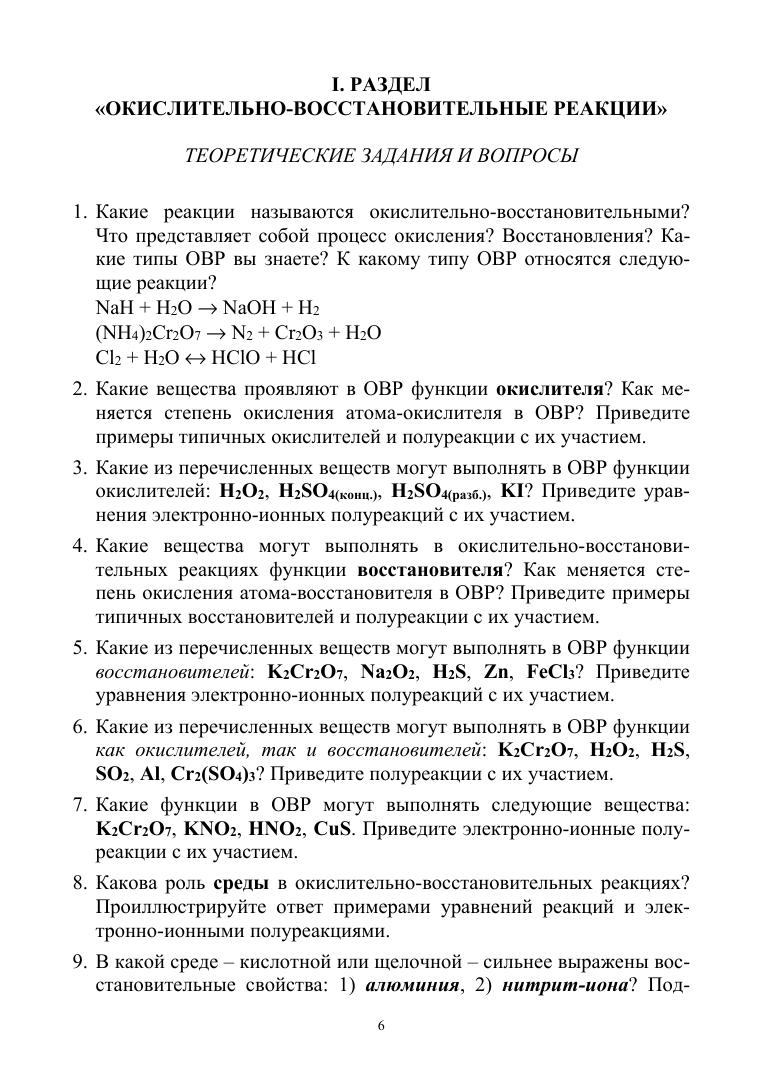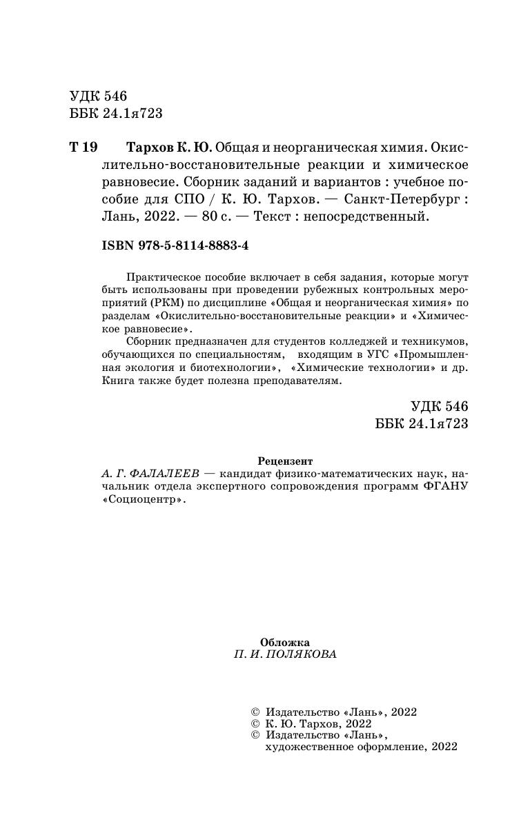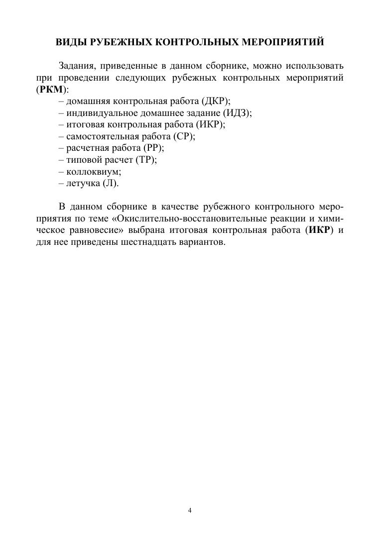 Практическое пособие включает в себя задания, которые могут быть использованы при проведении рубежных контрольных меро-приятий (РКМ) по дисциплине «Общая и неорганическая химия» по разделам «Окислительно-восстановительные реакции» и «Химическое равновесие». Сборник предназначен для студентов колледжей и техникумов, обучающихся по специальностям, входящим в УГС «Промышленная экология и биотехнологии», «Химические технологии» и др. Книга также будет полезна преподавателям.