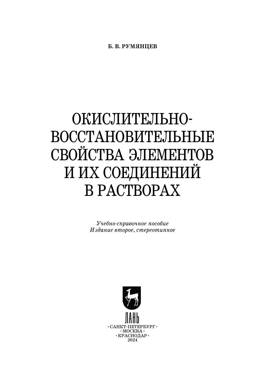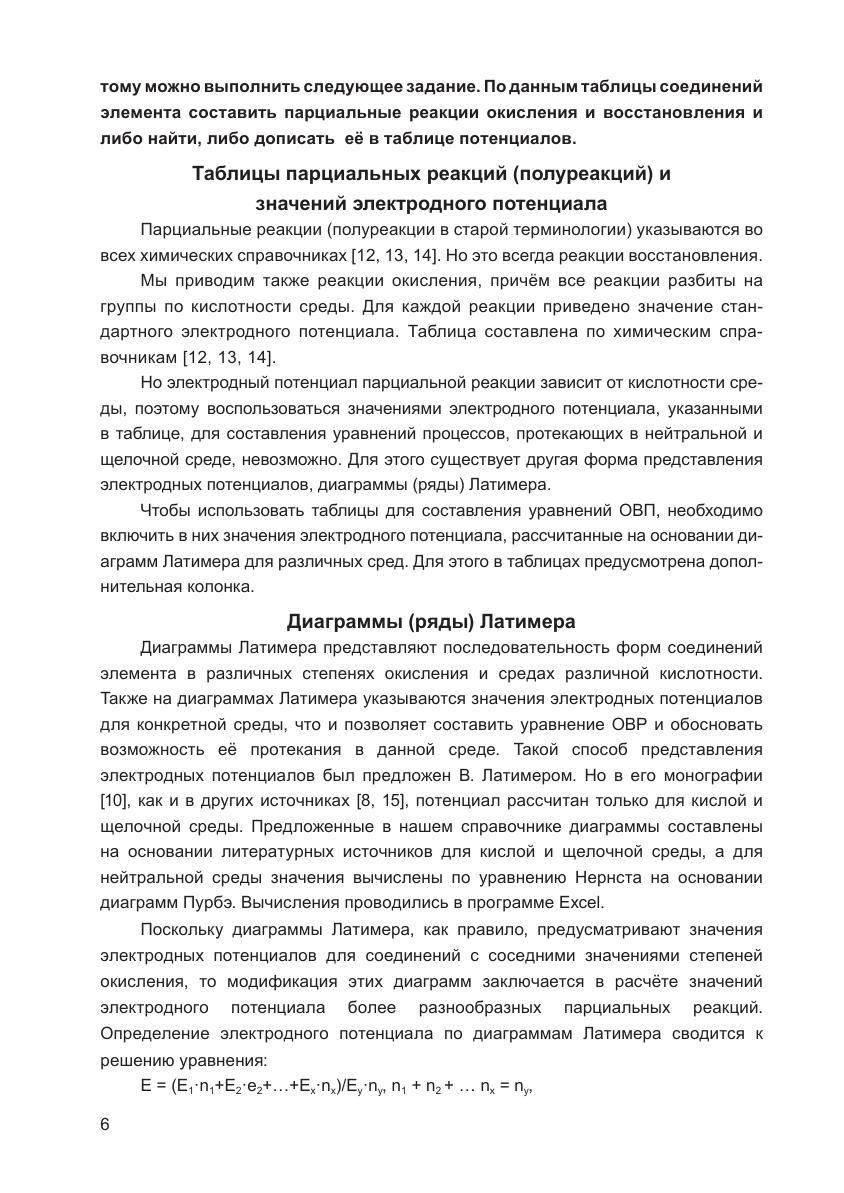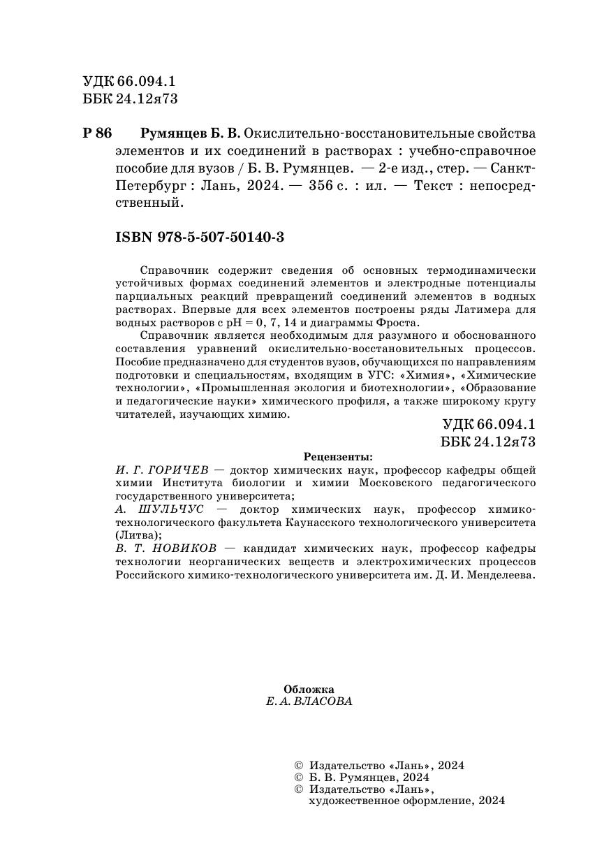 Справочник содержит сведения об основнях термодинамиченски устойчивых формах соединений элементов и электродные потенциалы парциальных реакций превращений соединений элементов в одных растворах. Впервые для всех элементов построены ряды Латимера для водных растворов с рН=0, 7, 14 и диаграммы Фроста. Справочник является необходимым для разумного и обоснованного составления уравнений окислительно-восстановительных процессов. Пособие предназначено для студентов вузов, обучающихся по направлениям подготовки и специальностям, входящим в УГС: «Химия», «Химические технологии», «Промышленная экология и биотехнология», «Образование и педагогические науки» химического профиля, а также широкому кругу читателей, изучающих химию.