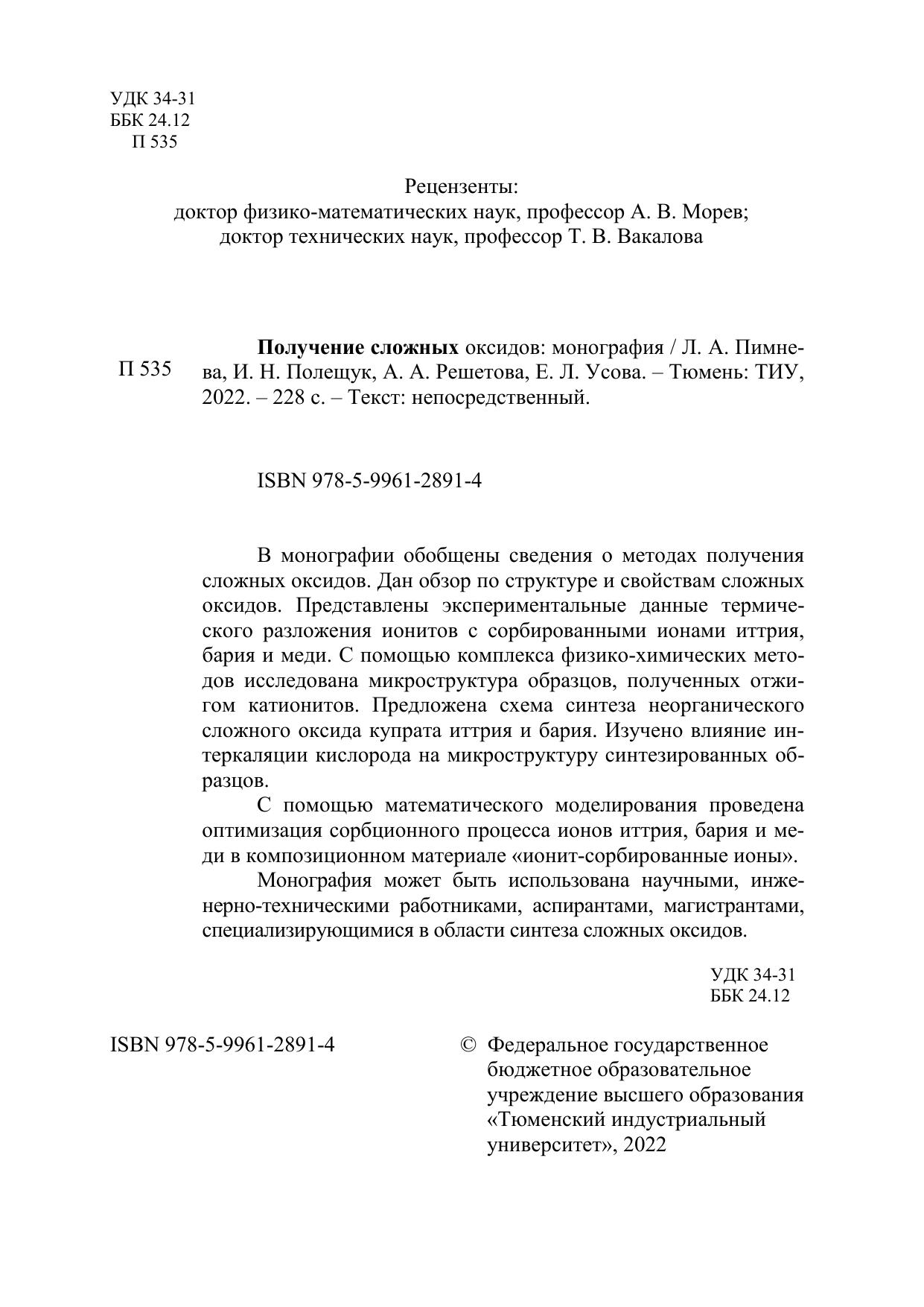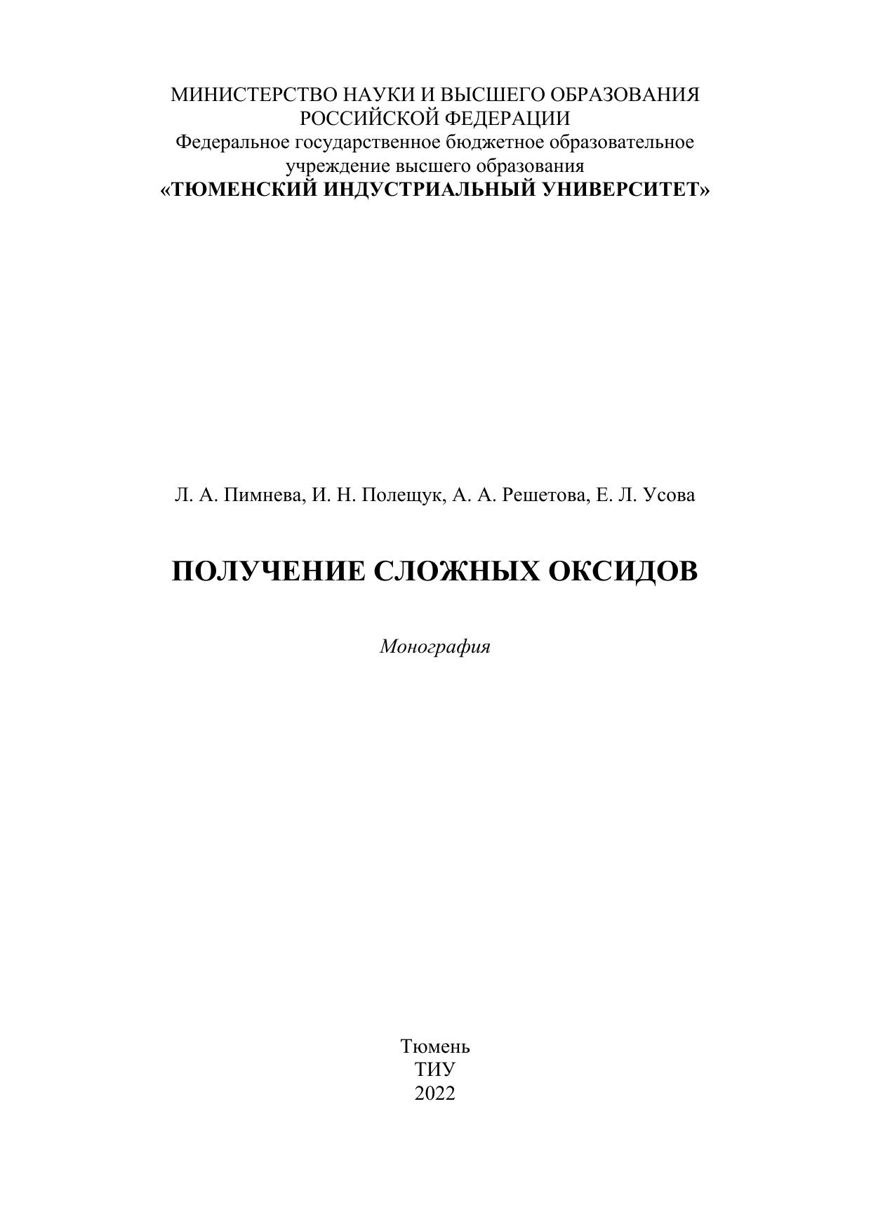 В монографии обобщены сведения о методах получения сложных оксидов. Дан обзор по структуре и свойствам сложных оксидов. Представлены экспериментальные данные термического разложения ионитов с сорбированными ионами иттрия, бария и меди. С помощью комплекса физико-химических методов исследована микроструктура образцов, полученных отжигом катионитов. Предложена схема синтеза неорганического сложного оксида купрата иттрия и бария. Изучено влияние интеркаляции кислорода на микроструктуру синтезированных образцов. С помощью математического моделирования проведена оптимизация сорбционного процесса ионов иттрия, бария и меди в композиционном материале «ионит-сорбированные ионы». Монография может быть использована научными, инженерно-техническими работниками, аспирантами, магистрантами, специализирующимися в области синтеза сложных оксидов.