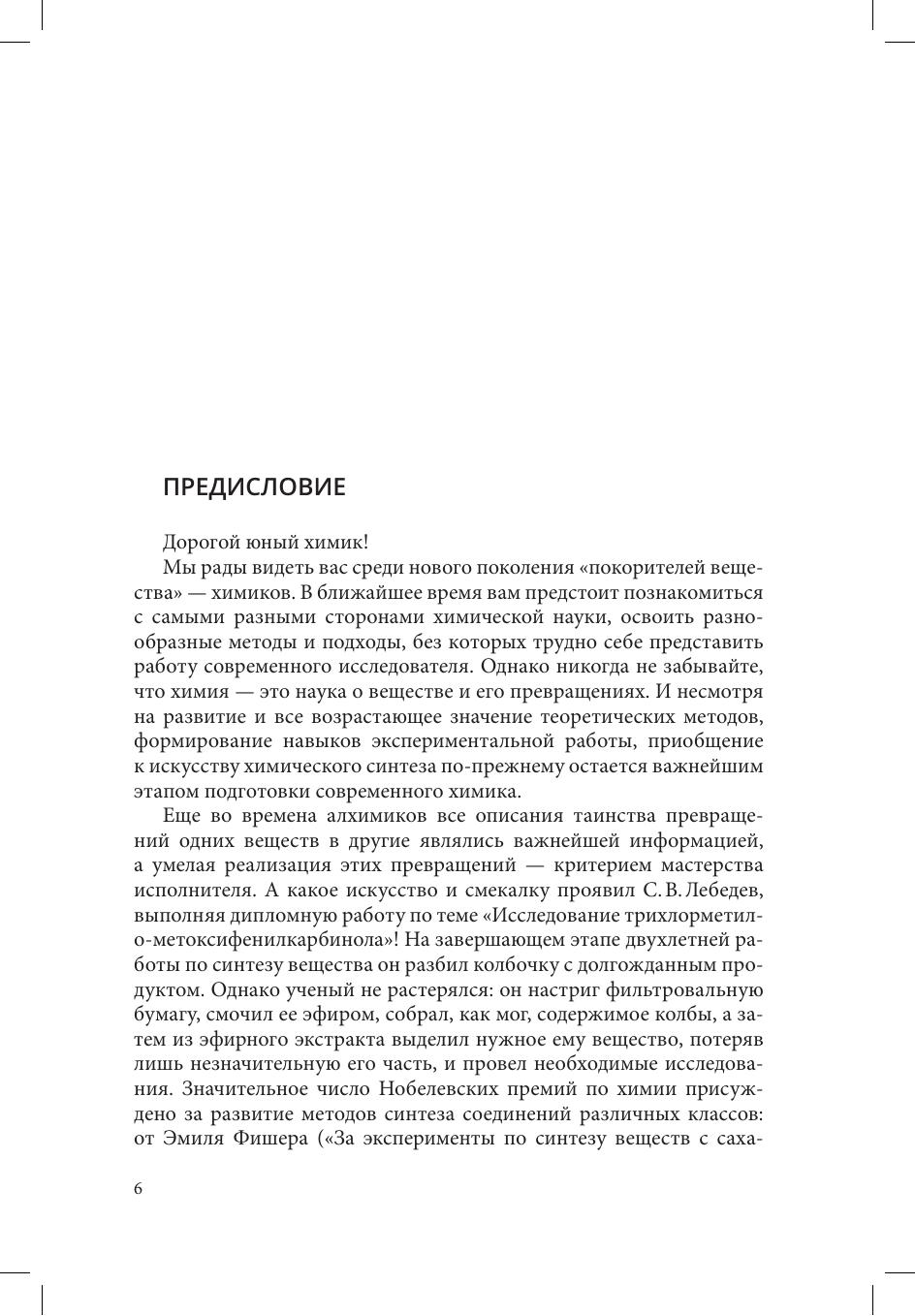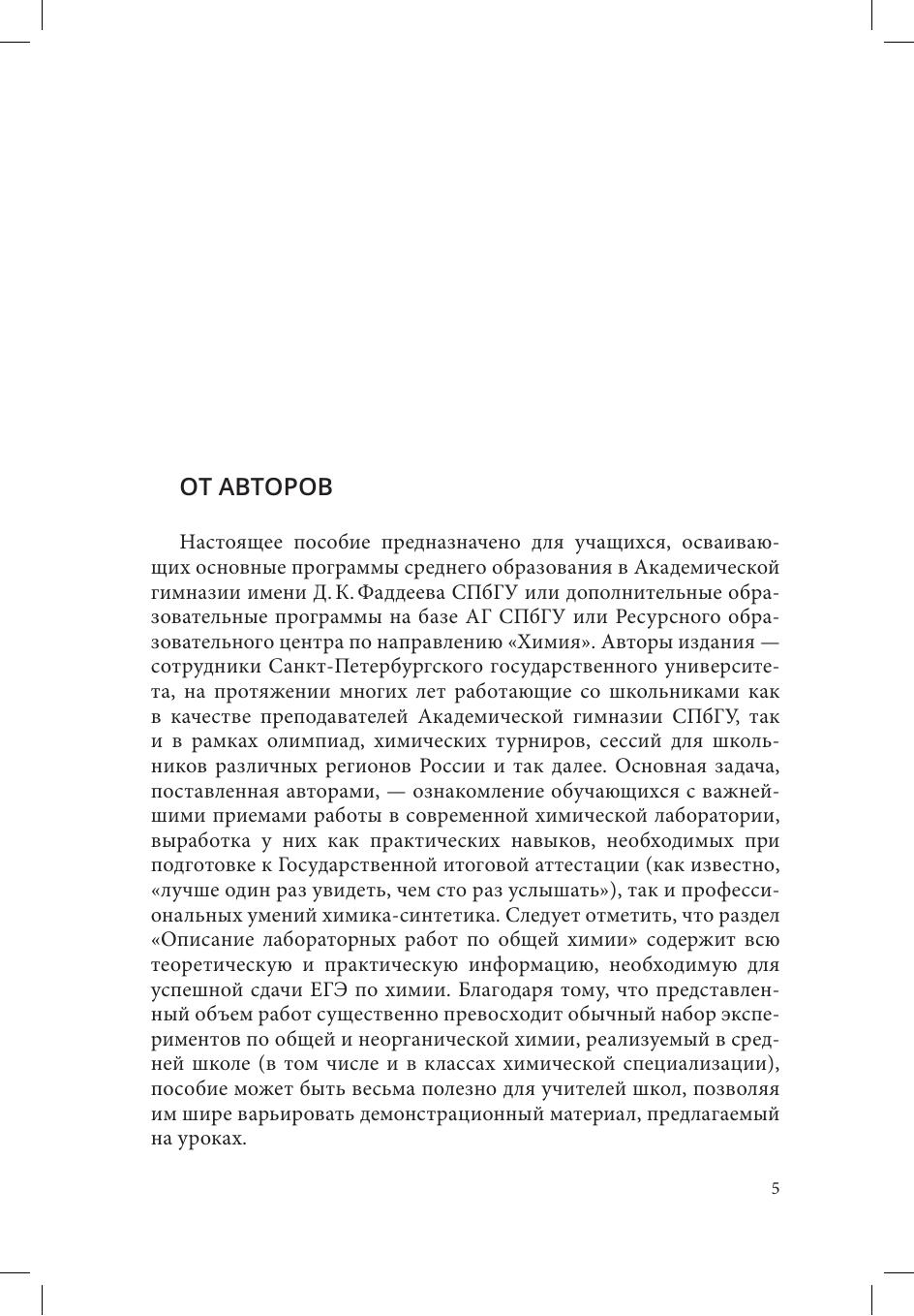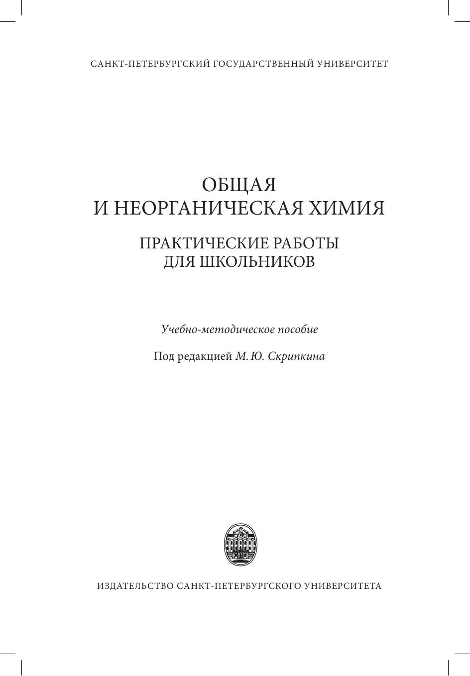 Предлагаемое пособие нацелено на ознакомление школьников с приемами работы в химической лаборатории и выработку практических навыков, необходимых при подготовке к Государственной итоговой аттестации, а также профессиональных умений химика-синтетика. Благодаря тому, что представленный в пособии объем работ существенно превосходит обычный набор экспериментов по общей и неорганической химии, реализуемый в средней школе (в том числе и в классах химической специализации), книга может оказаться весьма полезной для учителей школ, позволяя им шире варьировать демонстрационный материал, предлагаемый на уроках. Настоящее пособие предназначено для учащихся, осваивающих основные программы среднего образования в Академической гимназии имени Д. К. Фаддеева СПбГУ или дополнительные образовательные программы, реализуемые в СПбГУ.