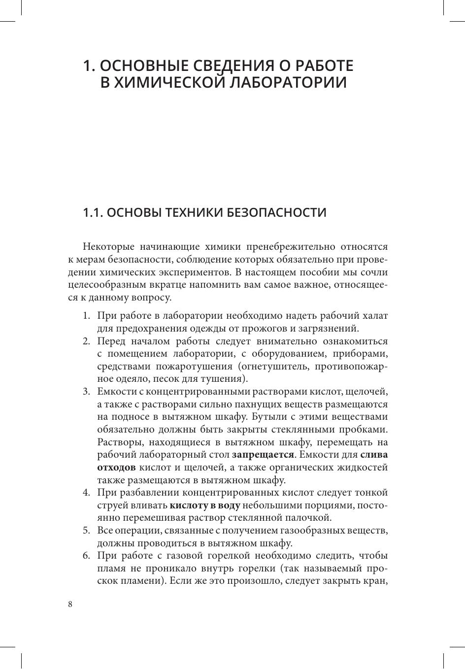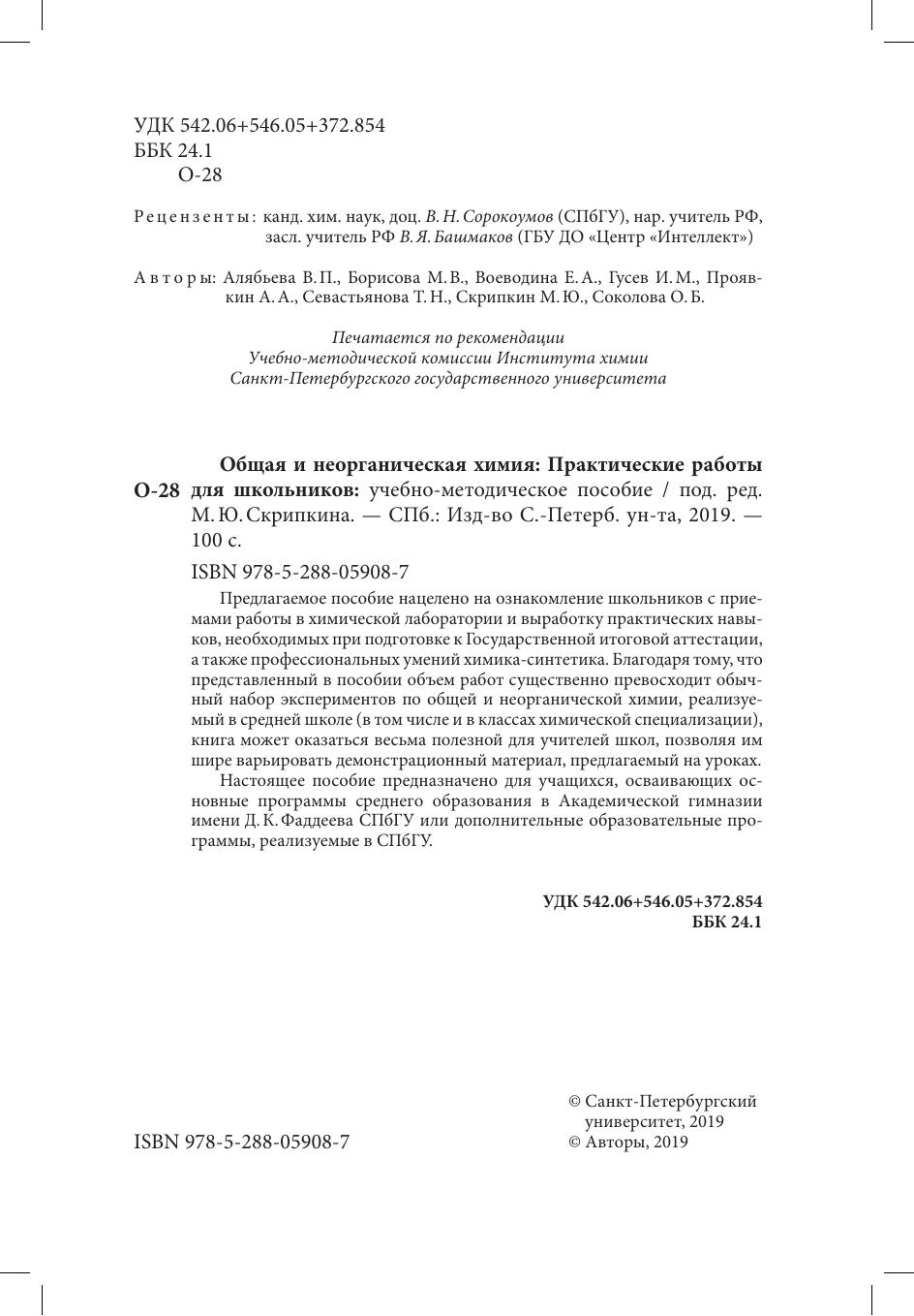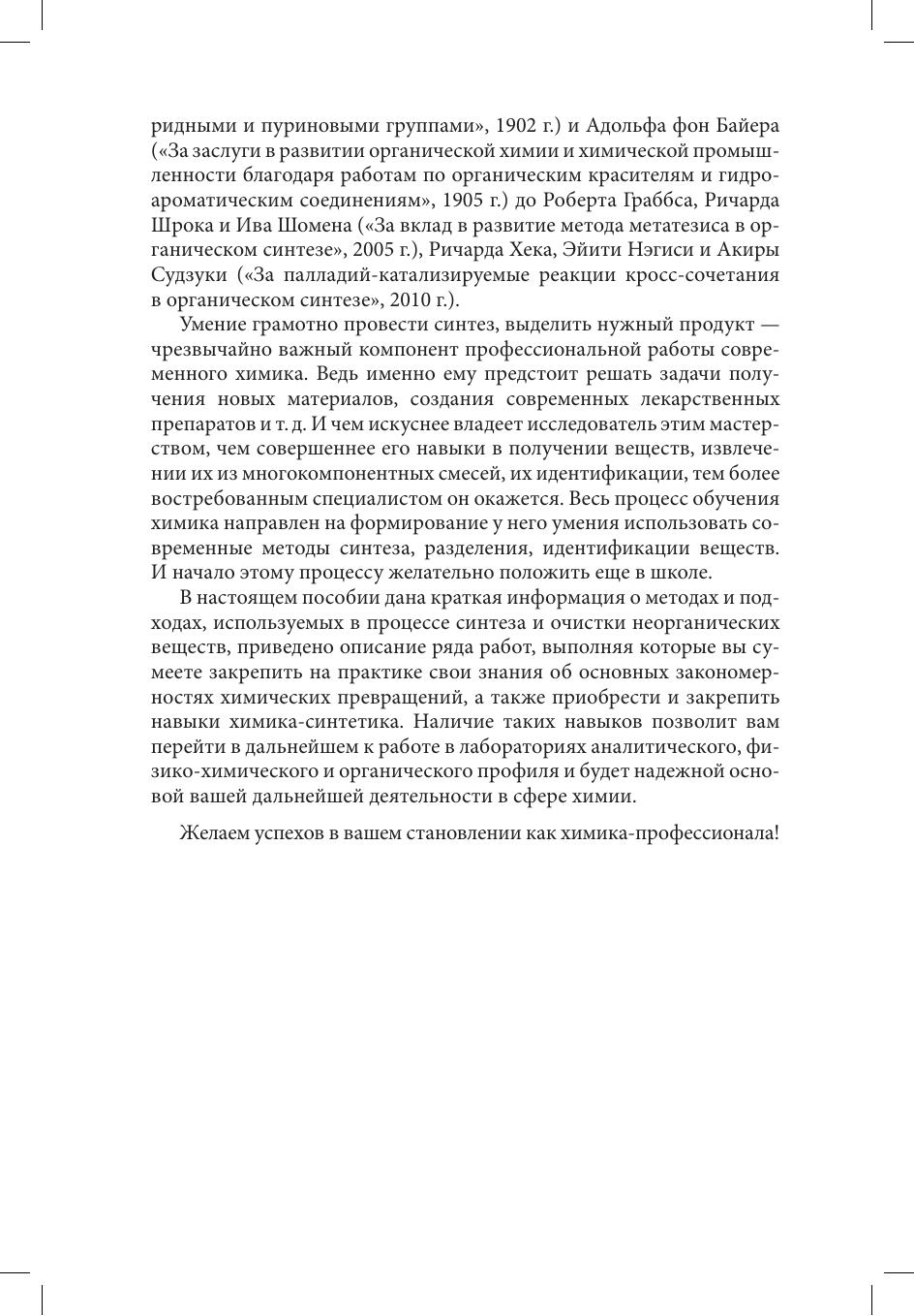 Предлагаемое пособие нацелено на ознакомление школьников с приемами работы в химической лаборатории и выработку практических навыков, необходимых при подготовке к Государственной итоговой аттестации, а также профессиональных умений химика-синтетика. Благодаря тому, что представленный в пособии объем работ существенно превосходит обычный набор экспериментов по общей и неорганической химии, реализуемый в средней школе (в том числе и в классах химической специализации), книга может оказаться весьма полезной для учителей школ, позволяя им шире варьировать демонстрационный материал, предлагаемый на уроках. Настоящее пособие предназначено для учащихся, осваивающих основные программы среднего образования в Академической гимназии имени Д. К. Фаддеева СПбГУ или дополнительные образовательные программы, реализуемые в СПбГУ.
