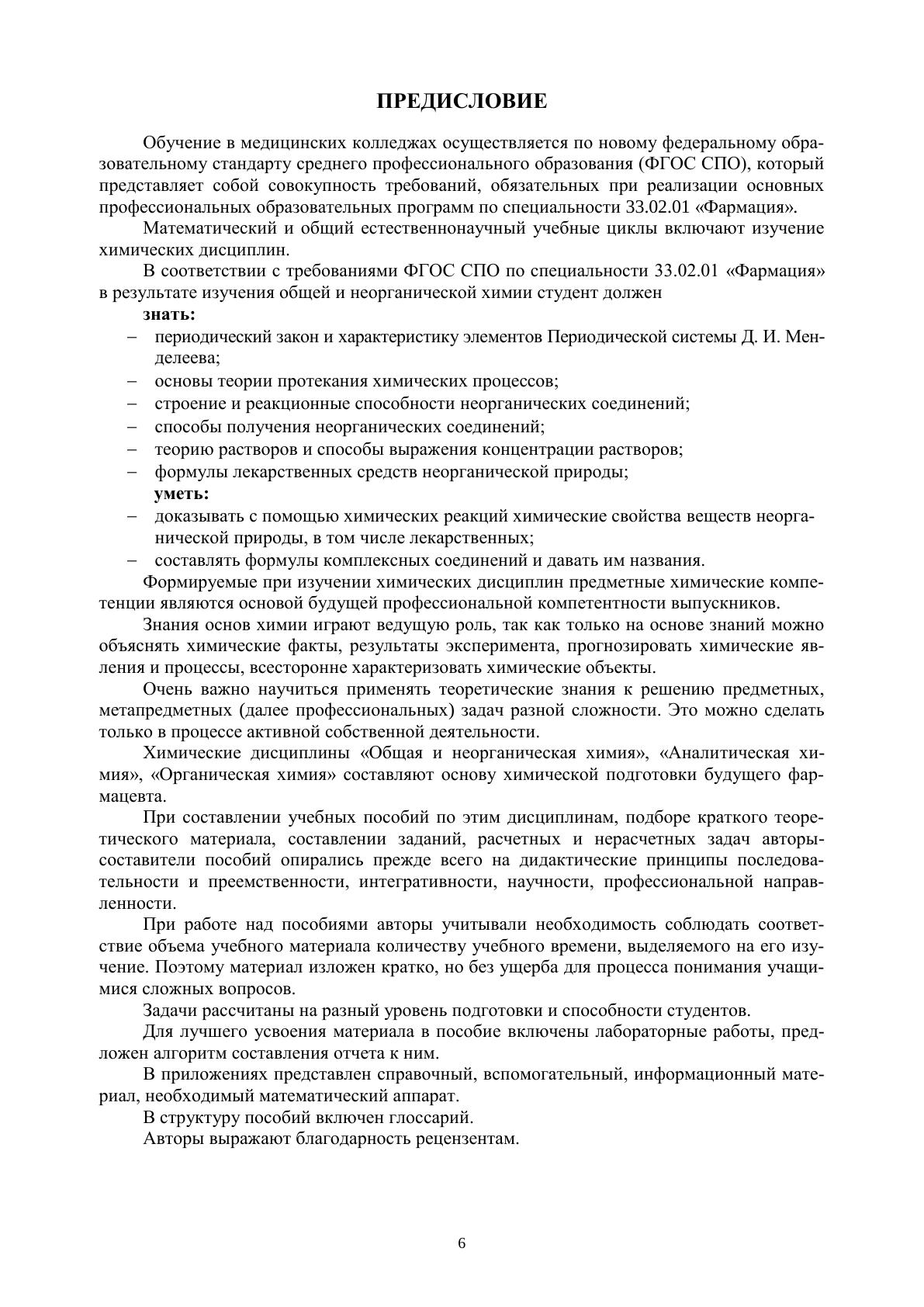Учебное пособие посвящено фундаментальному разделу «Общая и неорганическая химия», который является базой для изучения аналитической, органической и других разделов химии, важных и необходимых для профессиональной подготовки будущих фармацевтов. Входит в состав комплекса учебно-методических пособий: «Общая и неорганическая химия», «Аналитическая химия» (авторы Т.Г.Юдина, Л.В.Ненашева), «Органическая химия» (авторы З. М. Саркисян, А. В.де Векки, И. В. Шкутина). Учебные пособия объединены общей идеей, имеют общую структуру, нацелены на формирование как общекультурных, так и профессиональных компетенций будущего фармацевта. Для студентов медицинских колледжей, обучающихся по специальности «Фармация». Соответствует современным требованиям Федерального государственного образовательного стандарта среднего профессионального образования и профессиональным квалификационным требованиям.