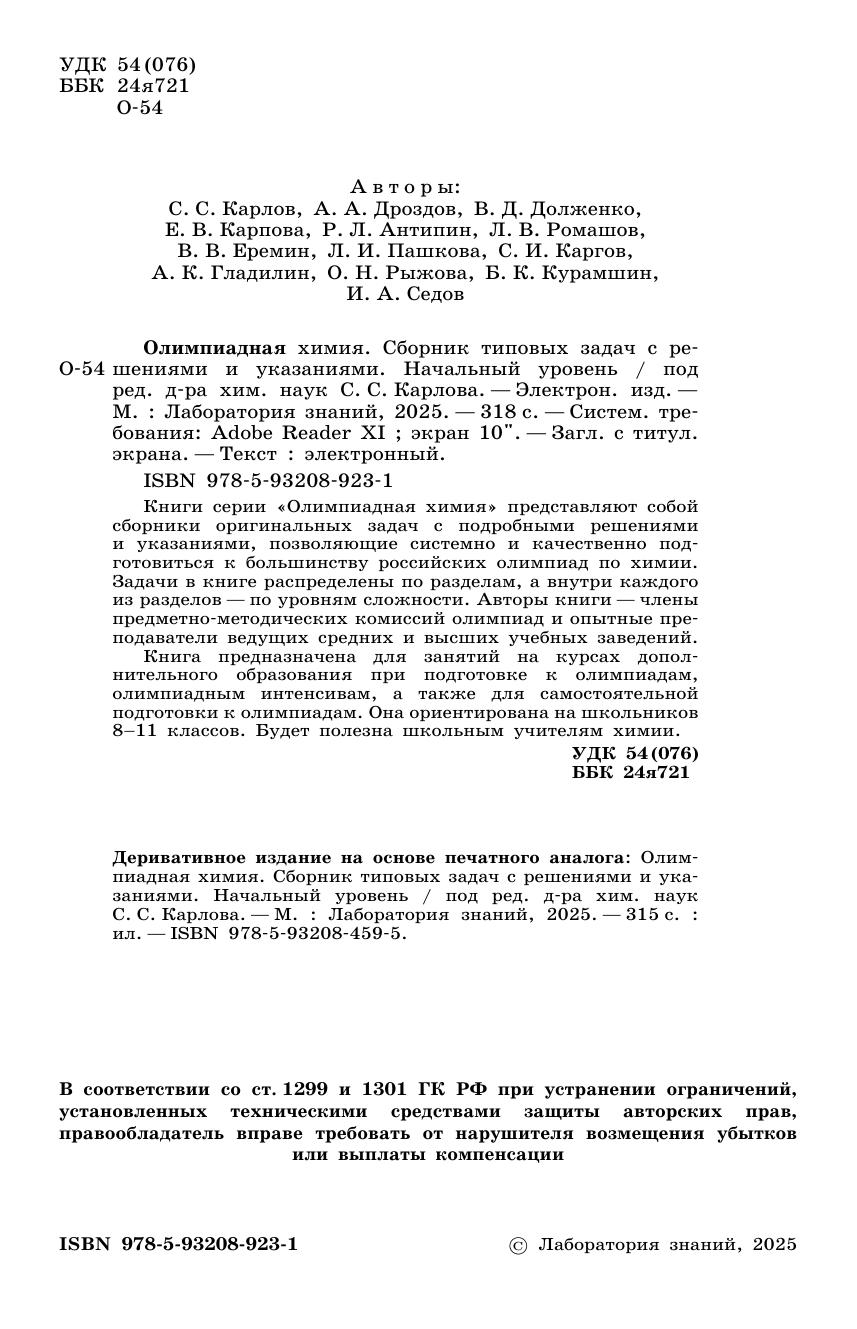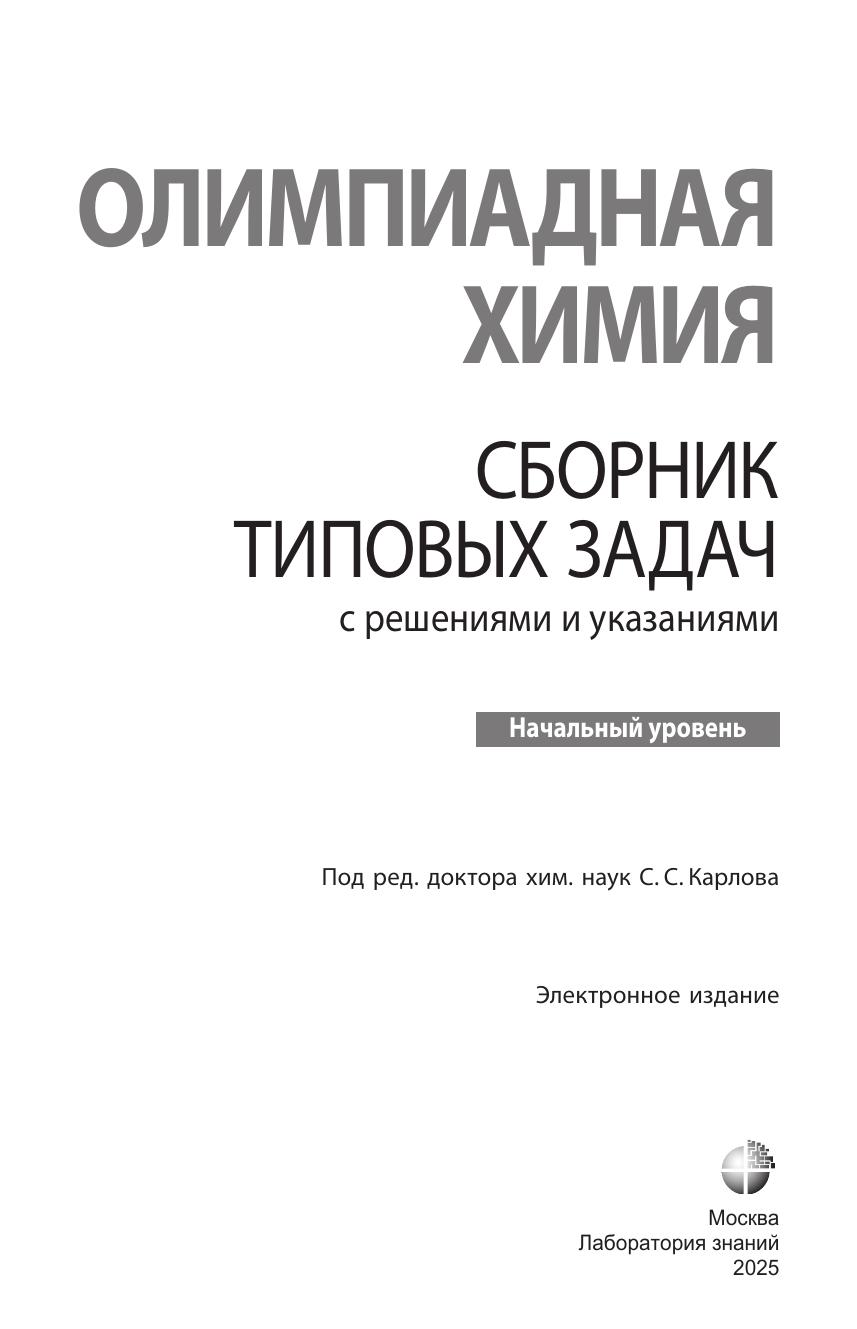 Книги серии «Олимпиадная химия» под редакцией Карлова С.С. представляют собой сборники оригинальных задач с подробными решениями и указаниями, позволяющие системно и качественно подготовиться к большинству российских олимпиад по химии. Задания в книгах представлены олимпиадные, т.е. они очень часто требуют нетривиального подхода в решении и выходят за пределы школьной программы. Задачи в данном сборнике разбиты на два разных уровня сложности, которые в свою очередь, разнесены на пять разделов по темам, встречающихся в олимпиадных задачах. Это задачи по: общей химии; неорганической химии (химии элементов); физической химии; органической химии; биохимии. Следом за данной книгой в серии «Олимпиадная химия» выйдет вторая книга «Олимпиадная химия. Сборник типовых задач с решениями и указаниями. Углубленный уровень» Авторы серии —члены предметно-методических комиссий олимпиад и опытные преподаватели ведущих средних и высших учебных заведений. Книга ориентирована на школьников 8–11 классов. Но также будет полезна школьным учителям химии.