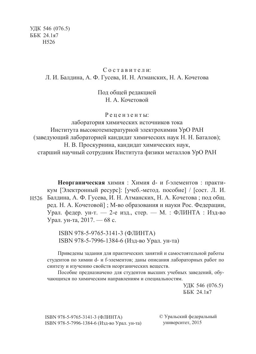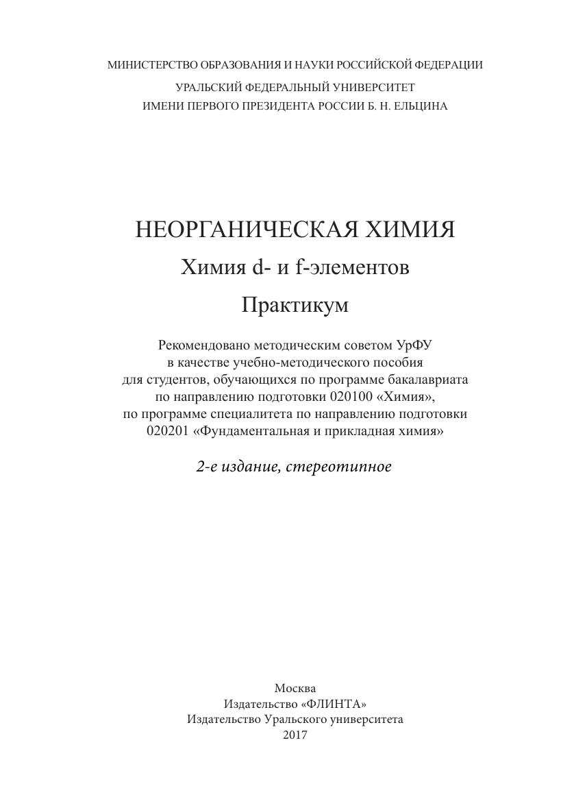 Приведены задания для практических занятий и самостоятельной работы студентов по химии d- и f-элементов; даны описания лабораторных работ по синтезу и изучению свойств неорганических веществ. Пособие предназначено для студентов высших учебных заведений, обучающихся по химическим направлениям и специальностям.