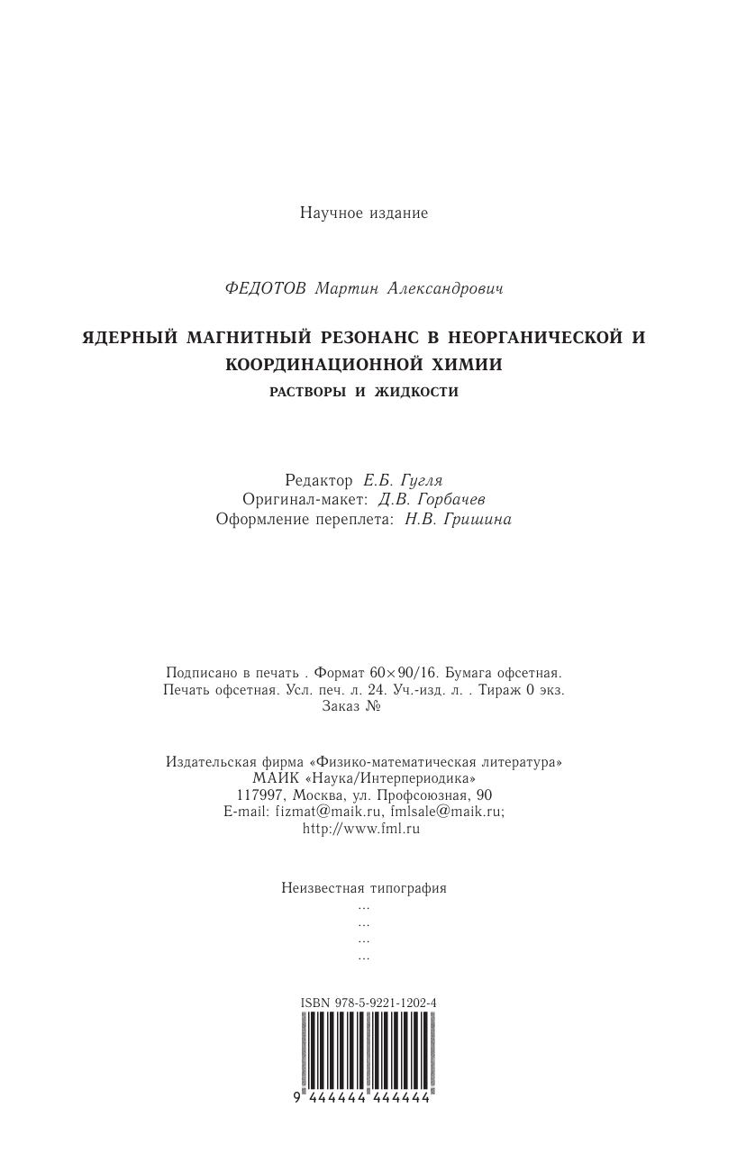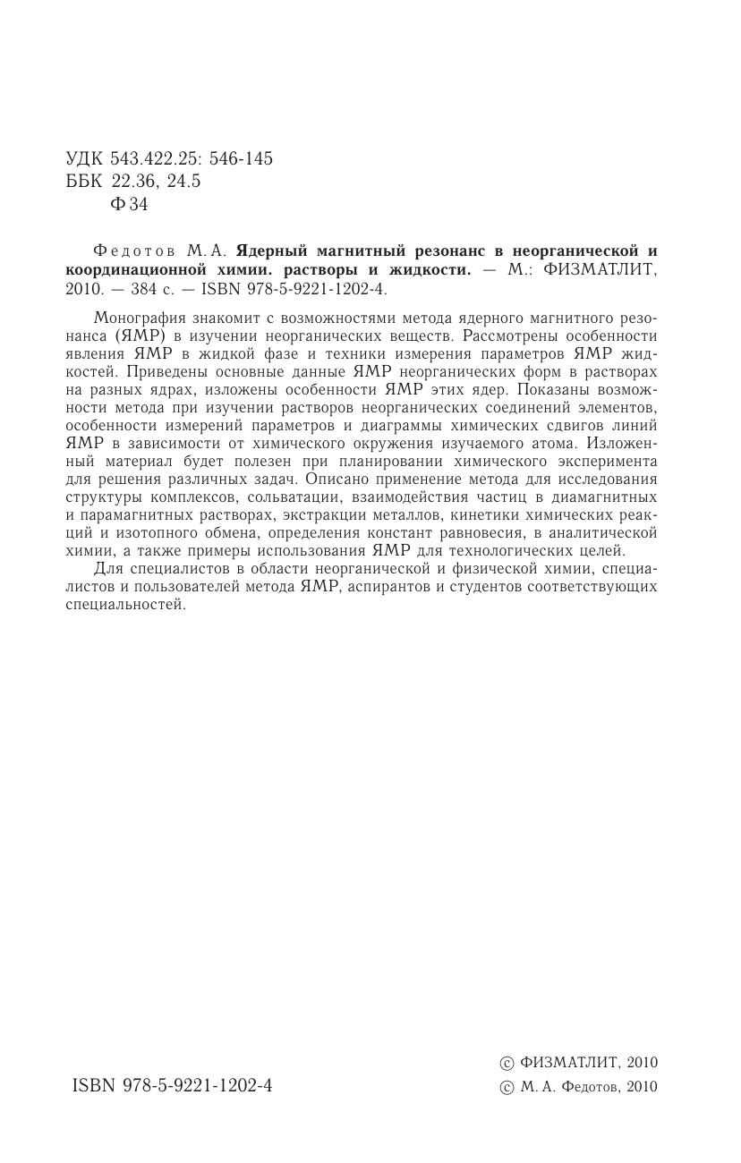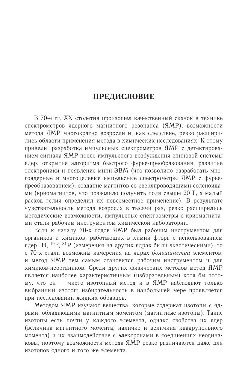 Монография знакомит с возможностями метода ядерного магнитного резонанса (ЯМР) в изучении неорганических веществ. Рассмотрены особенности явления ЯМР в жидкой фазе и техники измерения параметров ЯМР жидкостей. Приведены основные данные ЯМР неорганических форм в растворах на разных ядрах, изложены особенности ЯМР этих ядер. Показаны возможности метода при изучении растворов неорганических соединений элементов, особенности измерений параметров и диаграммы химических сдвигов линий ЯМР в зависимости от химического окружения изучаемого атома. Изложенный материал будет полезен при планировании химического эксперимента для решения различных задач. Описано применение метода для исследования структуры комплексов, сольватации, взаимодействия частиц в диамагнитных и парамагнитных растворах, экстракции металлов, кинетики химических реакций и изотопного обмена, определения констант равновесия, в аналитической химии, а также примеры использования ЯМР для технологических целей. Для специалистов в области неорганической и физической химии, специалистов и пользователей метода ЯМР, аспирантов и студентов соответствующих специальностей.
