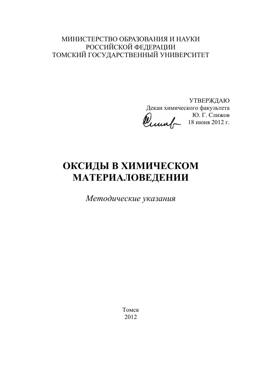 Методические указания по курсу «Оксиды в химическом материаловедении» предназначены для студентов IV курса химического факультета (направление подготовки 020100 ? Химия, профили подготовки 020100.62.01 – Неорганическая химия и химия координационных соединений, 020100.62.07 – Химия твердого тела и химия материалов).