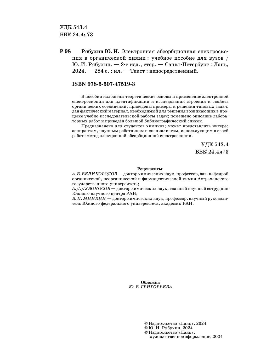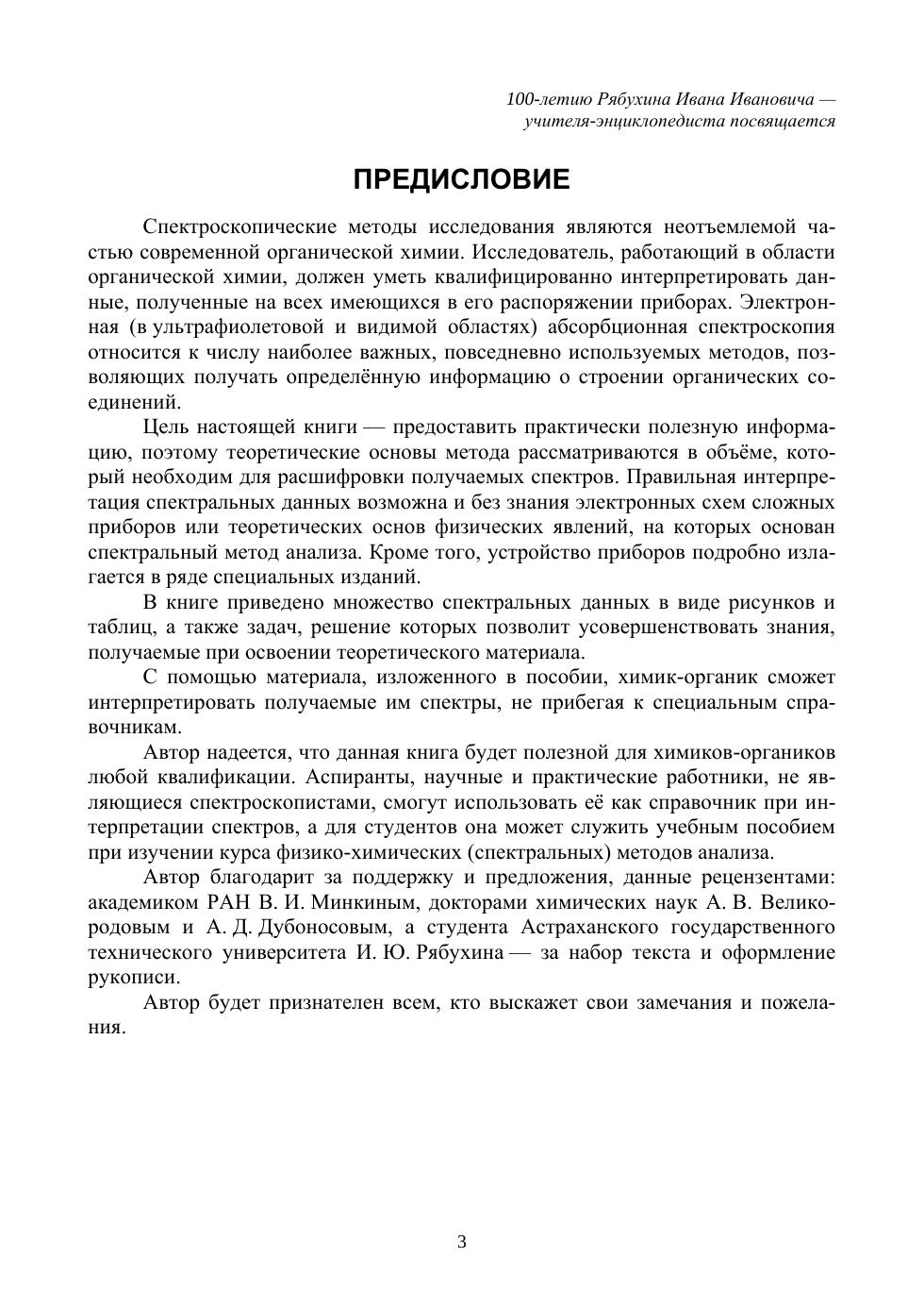 В пособии изложены теоретические основы и применение электронной спектроскопии для идентификации и исследования строения и свойств органических соединений, приведены примеры и решения типовых задач, дан фактический материал, необходимый для решения возникающих в процессе учебно-исследовательской работы задач, помещено описание лабораторных работ и приведён большой библиографический список. Предназначено для студентов-химиков, может представлять интерес аспирантам, научным работникам и специалистам, использующим в своей работе метод электронной абсорбционной спектроскопии.
