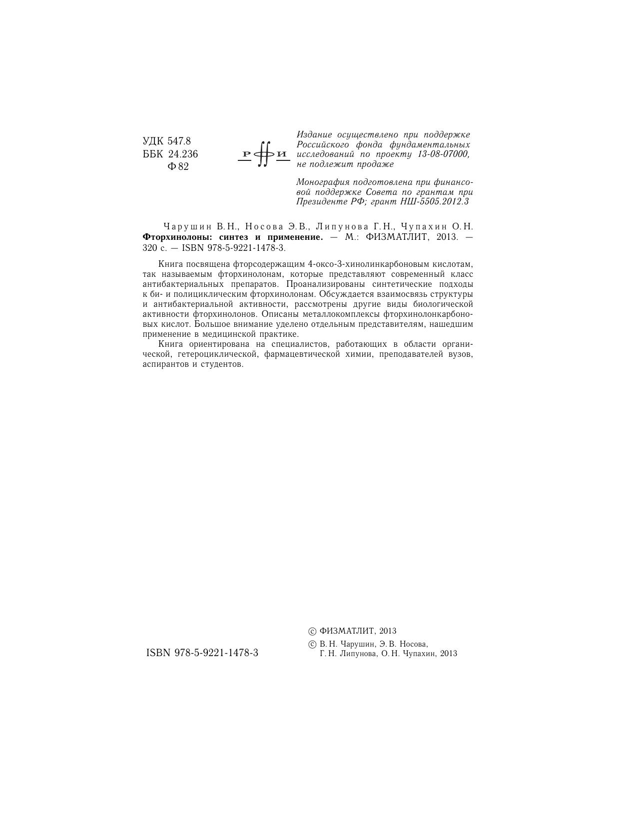Книга посвящена фторсодержащим 4-оксо-3-хинолинкарбоновым кислотам, так называемым фторхинолонам, которые представляют современный класс антибактериальных препаратов. Проанализированы синтетические подходы к би- и полициклическим фторхинолонам. Обсуждается взаимосвязь структуры и антибактериальной активности, рассмотрены другие виды биологической активности фторхинолонов. Описаны металлокомплексы фторхинолонкарбоновых кислот. Большое внимание уделено отдельным представителям, нашедшим применение в медицинской практике. Книга ориентирована на специалистов, работающих в области органической, гетероциклической, фармацевтической химии, преподавателей вузов,аспирантов и студентов.