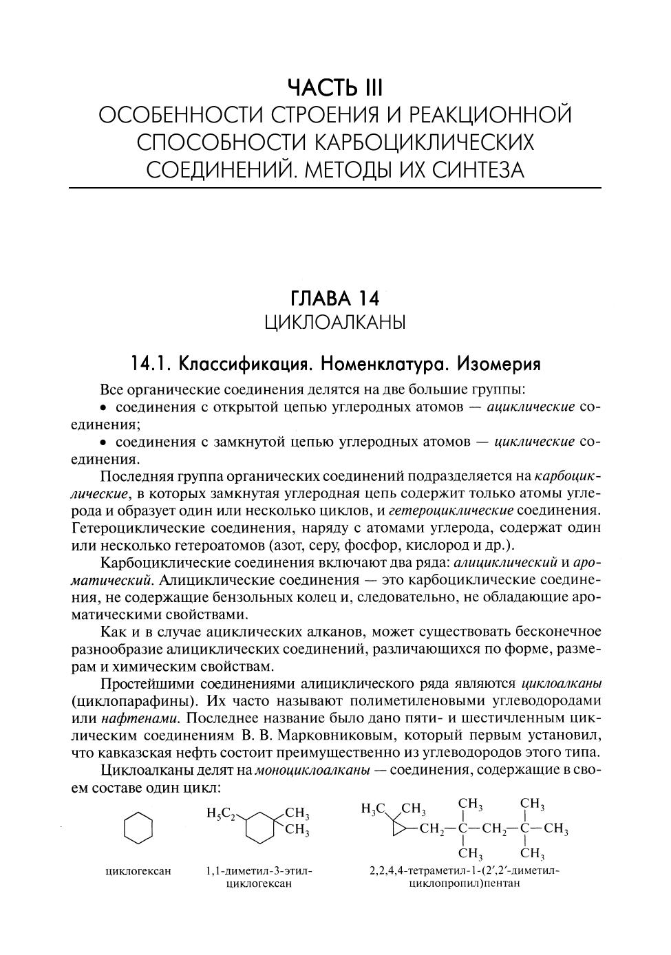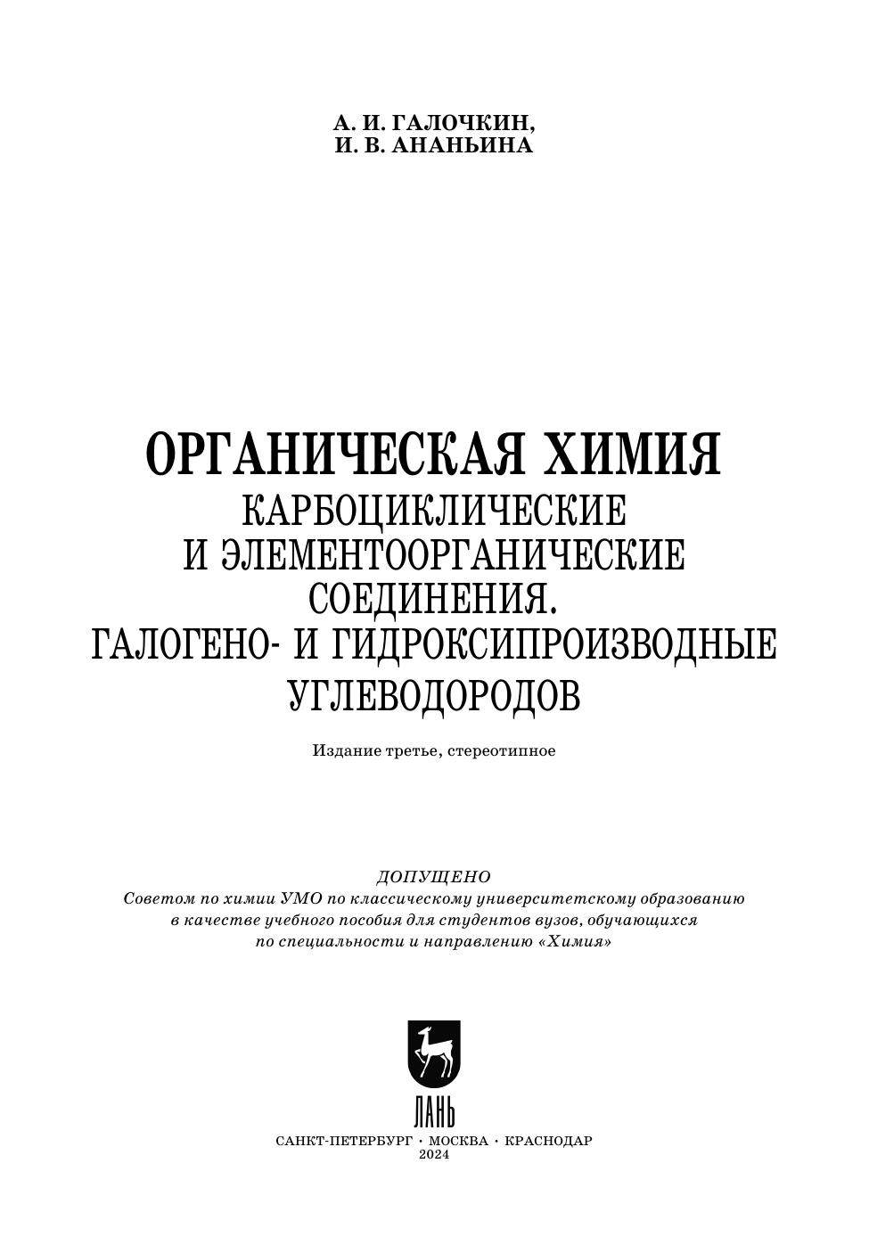 В книге изложены номенклатура, изомерия, способы получения, применения, спектральные методы идентификации, физические и химические свойства, механизмы реакций и реакционной способности карбоциклических соединений, галогено- и гидроксипроизводных углеводородов и элементоорганических соединений. Пособие предназначено для студентов вузов, обучающихся по направлению подготовки и специальности «Химия».