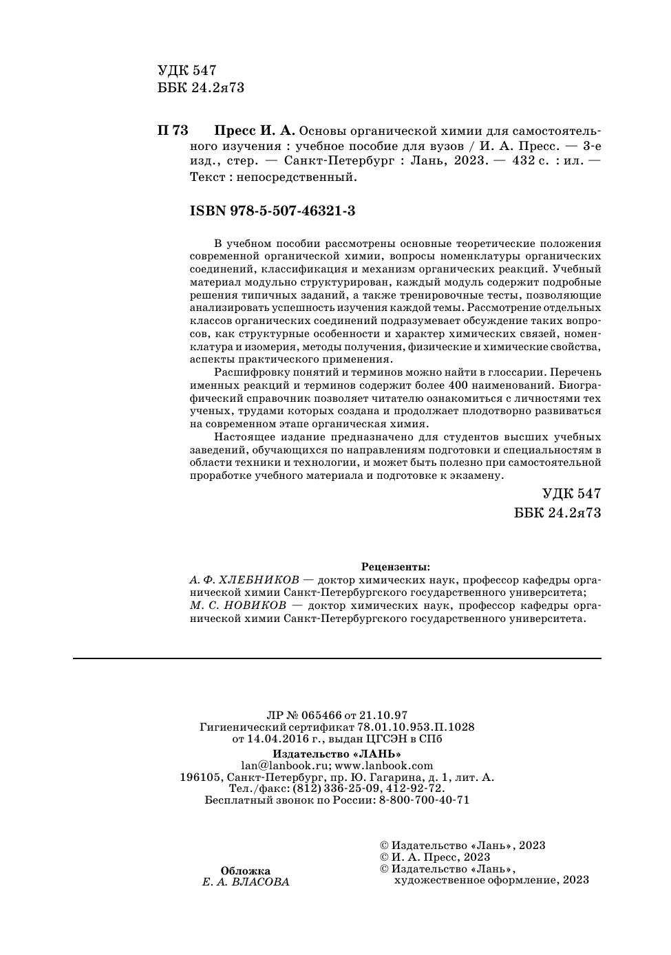 В учебном пособии рассмотрены основные теоретические положения современной органической химии, вопросы номенклатуры органических соединений, классификация и механизм органических реакций. Учебный материал модульно структурирован, каждый модуль содержит подробные решения типичных заданий, а также тренировочные тесты, позволяющие анализировать успешность изучения каждой темы. Рассмотрение отдельных классов органических соединений подразумевает обсуждение таких вопросов, как структурные особенности и характер химических связей, номенклатура и изомерия, методы получения, физические и химические свойства, аспекты практического применения. Расшифровку понятий и терминов можно найти в глоссарии. Перечень именных реакций и терминов содержит более 400 наименований. Биографический справочник позволяет читателю ознакомиться с личностями тех ученых, трудами которых создана и продолжает плодотворно развиваться на современном этапе органическая химия. Настоящее издание предназначено для студентов высших учебных заведений, обучающихся по направлениям подготовки и специальностям в области техники и технологии, и может быть полезно при самостоятельной проработке учебного материала и подготовке к экзамену.