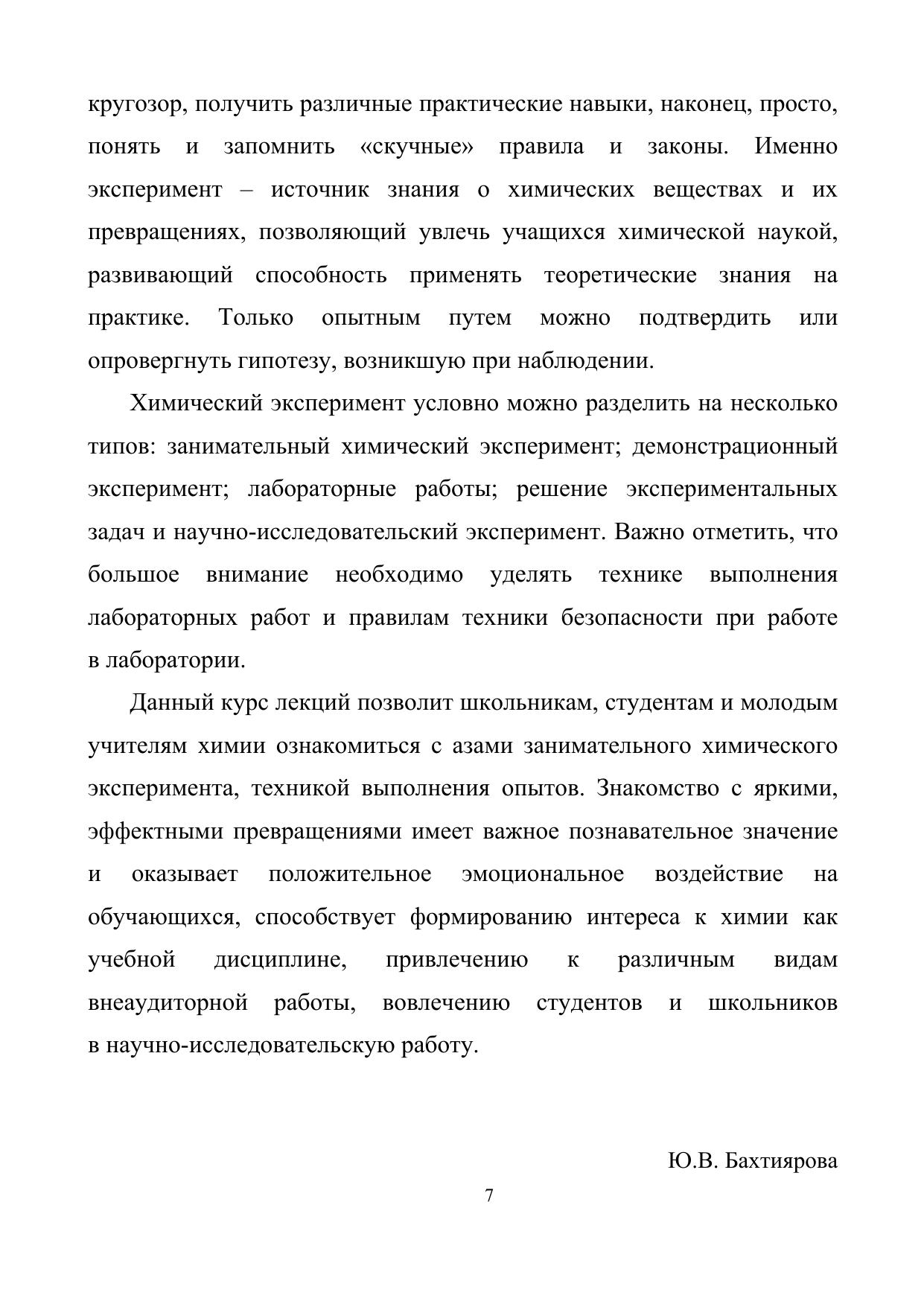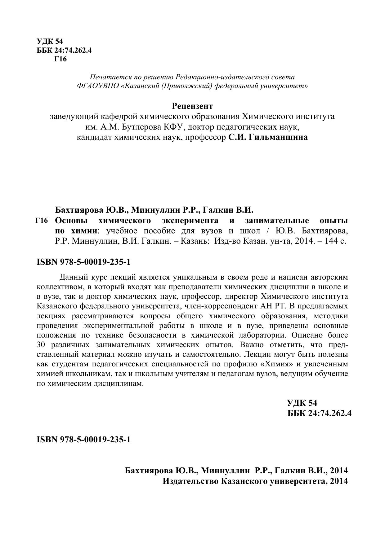 Казанского федерального университета, член-корреспондент АН РТ. В предлагаемых лекциях рассматриваются вопросы общего химического образования, методики проведения экспериментальной работы в школе и в вузе, приведены основные положения по технике безопасности в химической лаборатории. Описано более 30 различных занимательных химических опытов. Важно отметить, что представленный материал можно изучать и самостоятельно. Лекции могут быть полезны как студентам педагогических специальностей по профилю «Химия» и увлеченным химией школьникам, так и школьным учителям и педагогам вузов, ведущим обучение по химическим дисциплинам.