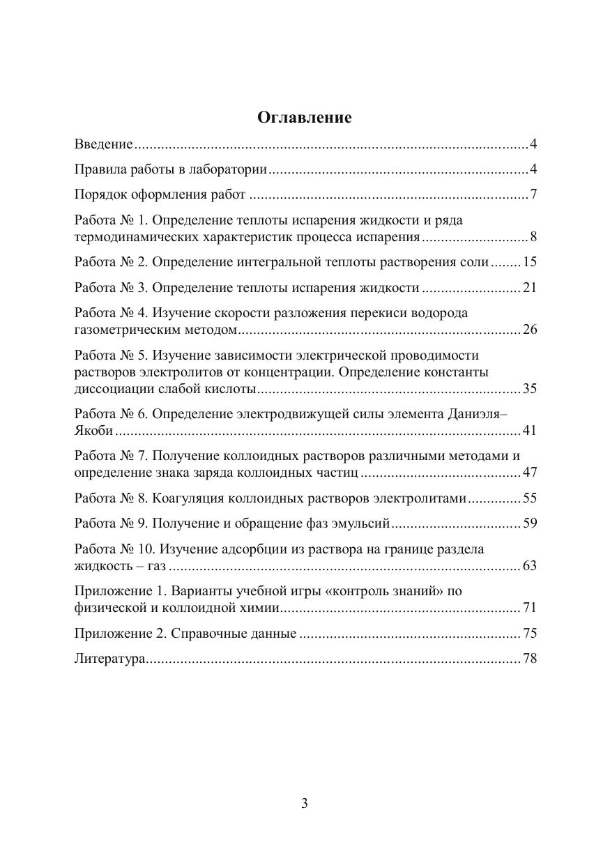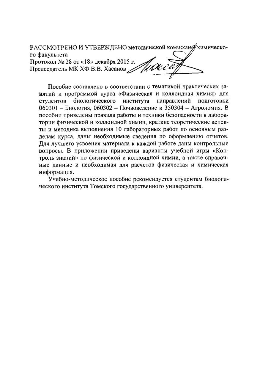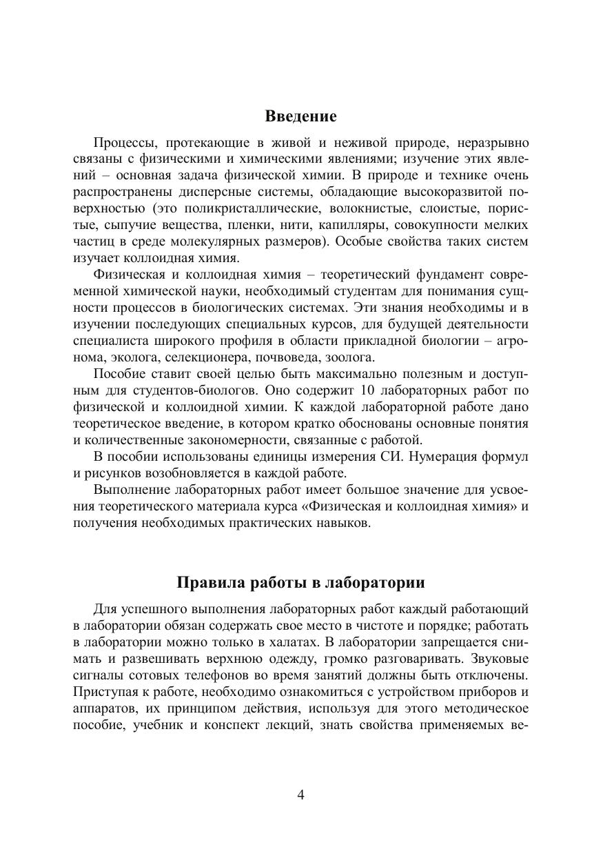 Пособие составлено в соответствии с тематикой практических занятий и программой курса «Физическая и коллоидная химия» для студентов биологического института направлений подготовки 060301 - Биология, 060302 - Почвоведение и 350304 - Агрономия. В пособии приведены правила работы и техники безопасности в лаборатории физической и коллоидной химии, краткие теоретические аспекты и методика выполнения 10 лабораторных работ по основным разделам курса, даны необходимые сведения по оформлению отчетов. Дня лучшего усвоения материала к каждой работе даны контрольные вопросы. В приложении приведены варианты учебной игры «Контроль знаний» по физической и коллоидной химии, а также справочные данные и необходимая для расчетов физическая и химическая информация. Учебно-методическое пособие рекомендуется студентам биологического института Томского государственного университета.