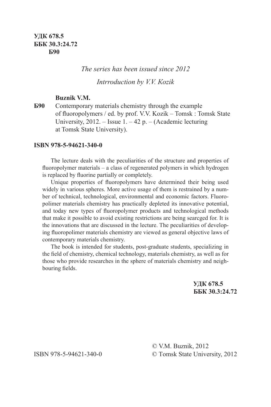В лекции рассмотрены особенности строения и свойств фторполимерных материалов – класса искусственных полимеров, в которых водород частично или полностью замещен на фтор. Уникальные свойства фторполимеров определили их широкое при- менение в различных отраслях. Более активное их использование сдерживается рядом технических, технологических, экологических и экономических факторов. Фторполимерное материаловедение практически исчерпало свой инновационный потенциал, сегодня идет интенсивный поиск новых типов фторполимерных продуктов и технологических приемов, устраняющих существующие ограничения. Именно эти новшества и обсуждаются в лекции. Особенности развития фторполимерного материаловедения рассматриваются как общие закономерности всего современного материаловедения. Для студентов, аспирантов, специализирующихся в области химии, химической технологии, материаловедения, а также исследователей, уже работающих в материаловедении и смежных областях.