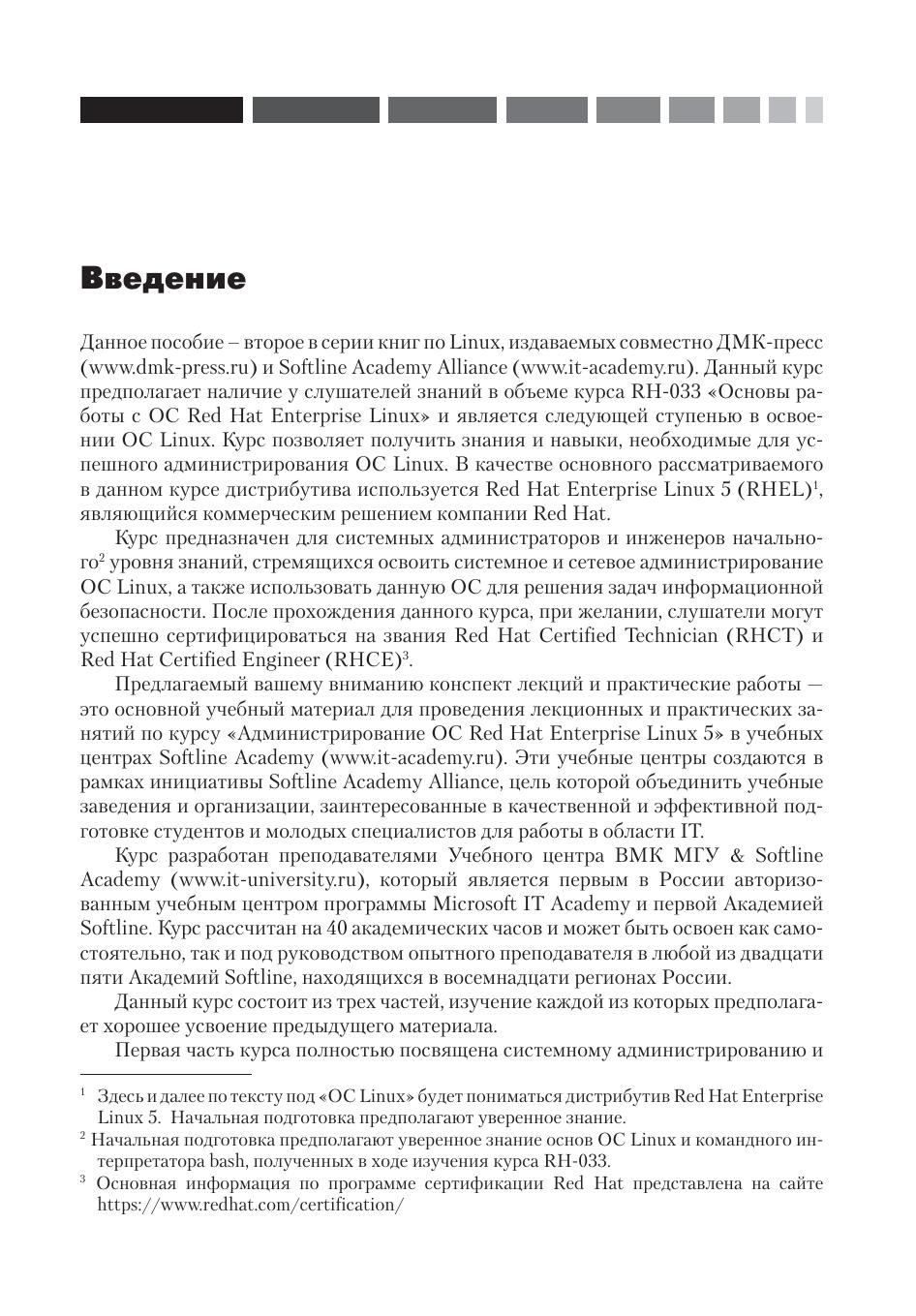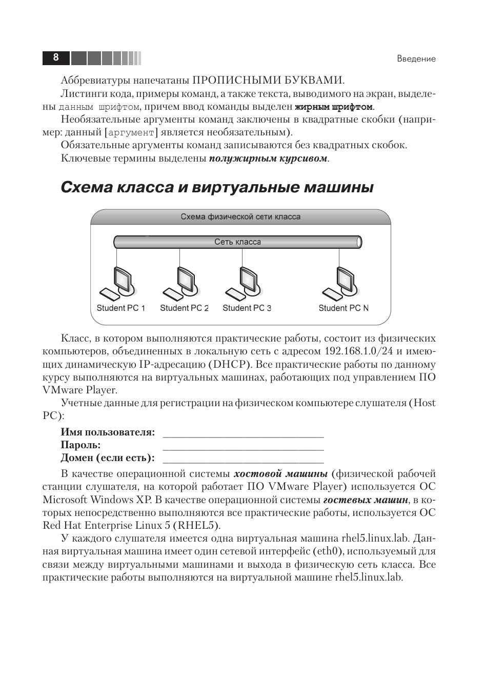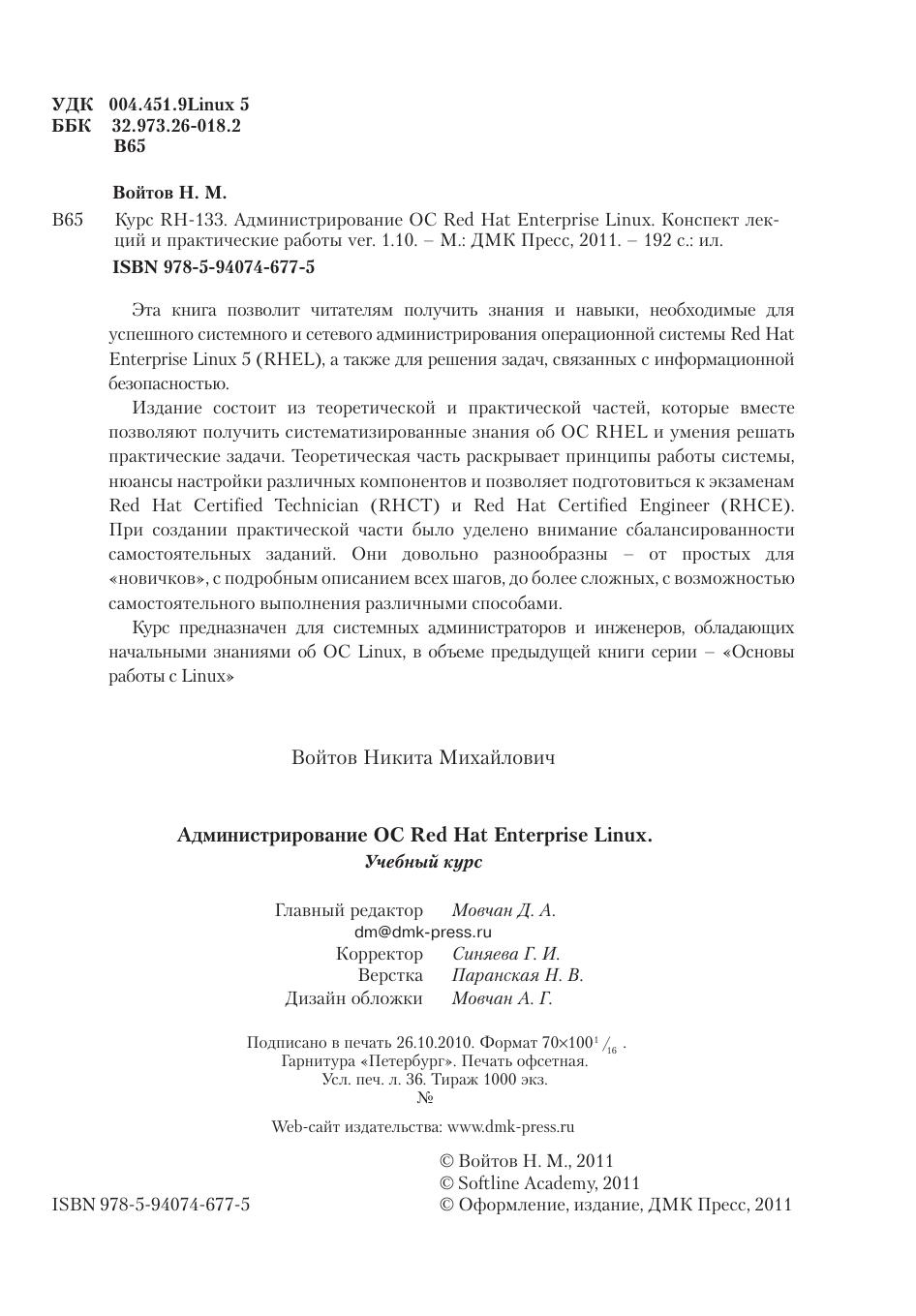 Эта книга позволит читателям получить знания и навыки, необходимые для успешного системного и сетевого администрирования операционной системы Red Hat Enterprise Linux 5 (RHEL), а также для решения задач, связанных с информационной безопасностью. Издание состоит из теоретической и практической частей, которые вместе позволяют получить систематизированные знания об ОС RHEL и умения решать практические задачи. Теоретическая часть раскрывает принципы работы системы, нюансы настройки различных компонентов и позволяет подготовиться к экзаменам Red Hat Certified Technician (RHCT) и Red Hat Certified Engineer (RHCE). При создании практической части было уделено внимание сбалансированности самостоятельных заданий. Они довольно разнообразны – от простых для «новичков», с подробным описанием всех шагов, до более сложных, с возможностью самостоятельного выполнения различными способами. Курс предназначен для системных администраторов и инженеров, обладающих начальными знаниями об ОС Linux, в объеме предыдущей книги серии – «Основы работы с Linux».