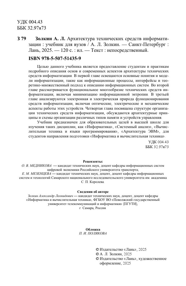 Целью данного учебника является предоставление студентам и практикам подробного описания основ и современных аспектов архитектуры технических средств информатизации. В первой главе освещаются основные понятия и модели информатизации, такие как информационные процессы, интерфейсы и теоретико-множественный подход к описанию информационных систем. Во второй главе рассматривается функциональное многообразие технических средств информатизации, включая минимизацию информационной энтропии. В третьей главе анализируются электронная и электрическая природа функционирования средств информатизации, включая оптические, электрические и механические аспекты работы этих устройств. Четвертая глава посвящена структуре организации технических средств информатизации, обсуждаются архитектурные принципы и схемы организации различных типов памяти и устройств управления. Учебник предназначен для образовательных целей в высшей школе для изучения таких дисциплин, как «Информатика», «Системный анализ», «Вычислительная техника и языки программирования», «Архитектура ЭВМ», для студентов направления подготовки «Информатика и вычислительная техника».