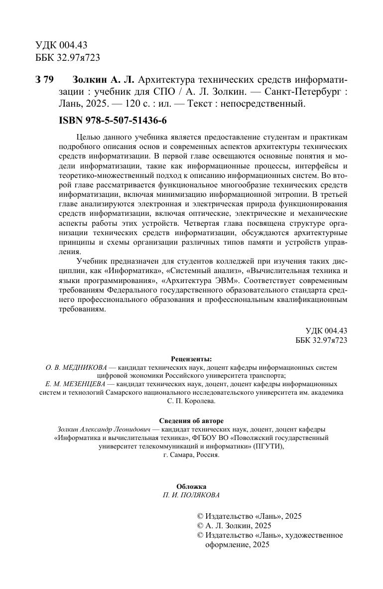 Целью данного учебника является предоставление студентам и практикам подробного описания основ и современных аспектов архитектуры технических средств информатизации. В первой главе освещаются основные понятия и модели информатизации, такие как информационные процессы, интерфейсы и теоретико-множественный подход к описанию информационных систем. Во второй главе рассматривается функциональное многообразие технических средств информатизации, включая минимизацию информационной энтропии. В третьей главе анализируются электронная и электрическая природа функционирования средств информатизации, включая оптические, электрические и механические аспекты работы этих устройств. Четвертая глава посвящена структуре организации технических средств информатизации, обсуждаются архитектурные принципы и схемы организации различных типов памяти и устройств управления. Учебник предназначен для студентов колледжей при изучения таких дисциплин, как «Информатика», «Системный анализ», «Вычислительная техника и языки программирования», «Архитектура ЭВМ». Соответствует современным требованиям Федерального государственного образовательного стандарта среднего профессионального образования и профессиональным квалификационным требованиям.
