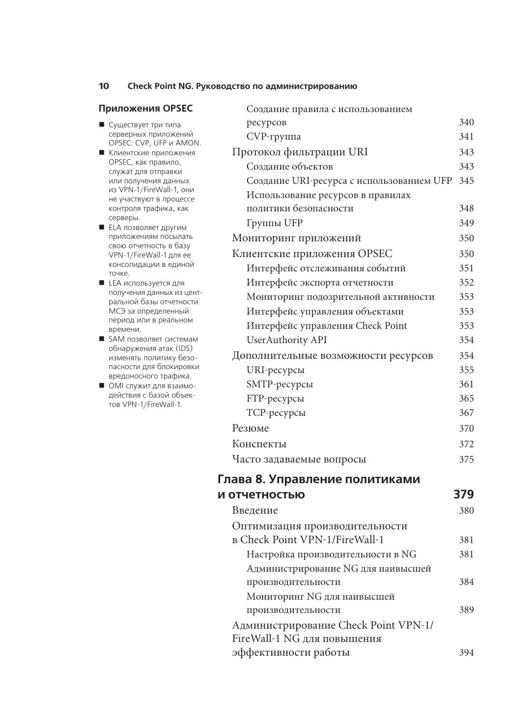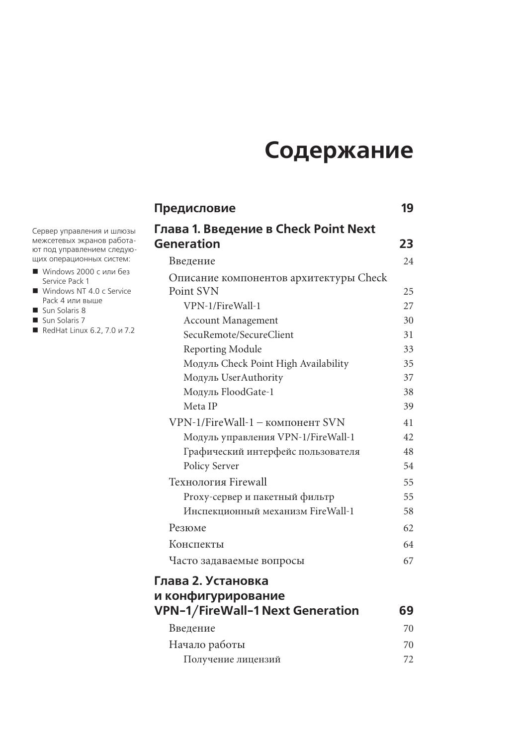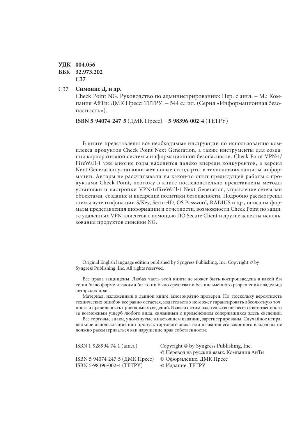 В книге представлены все необходимые инструкции по использованию комплекса продуктов Check Point Next Generation, а также инструменты для создания корпоративной системы информационной безопасности. Check Point VPN-1/FireWall-1 уже многие годы находится далеко впереди конкурентов, а версия Next Gene ration устанавливает новые стандарты в технологиях защиты информации. Авторы не рассчитывали на какой-то опыт предыдущей работы с продуктами Check Point, поэтому в книге последовательно представлены методы установки и настройки VPN-1/FireWall-1 Next Generation, управление сетевыми объектами, создание и внедрение политики безопасности. Подробно рассмотрены схемы аутентификации S/Key, SecureID, OS Password, RADIUS и др., описаны форматы представления информации и отчетности, возможности Check Point по защите удаленных VPN-клиентов с помощью ПО Secure Client и другие аспекты использования продуктов линейки NG.