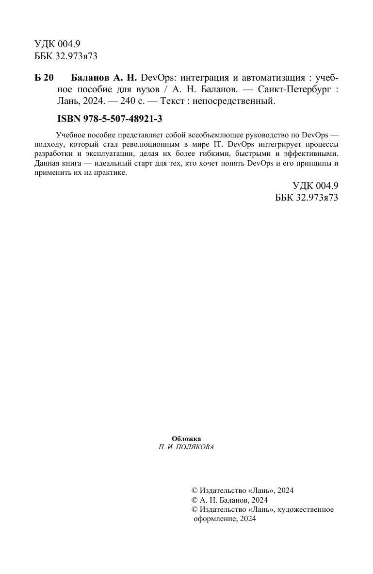 Учебное пособие представляет собой всеобъемлющее руководство по DevOps — подходу, который стал революционным в мире IT. DevOps интегрирует процессы разработки и эксплуатации, делая их более гибкими, быстрыми и эффективными. Данная книга — идеальный старт для тех, кто хочет понять DevOps и его принципы и применить их на практике.