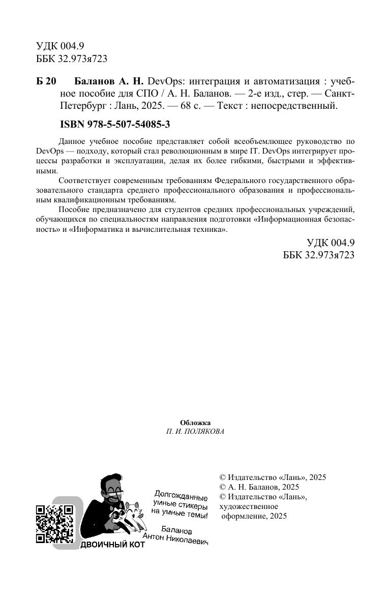 Данное учебное пособие представляет собой всеобъемлющее руководство по DevOps — подходу, который стал революционным в мире IT. DevOps интегрирует процессы разработки и эксплуатации, делая их более гибкими, быстрыми и эффективными. Соответствует современным требованиям Федерального государственного образовательного стандарта среднего профессионального образования и профессиональным квалификационным требованиям. Пособие предназначено для студентов средних профессиональных учреждений, обучающихся по специальностям направления подготовки «Информационная безопасность» и «Информатика и вычислительная техника».