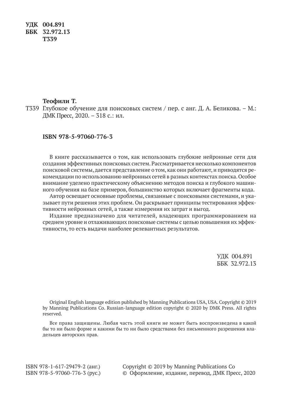 В книге рассказывается о том, как использовать глубокие нейронные сети для создания эффективных поисковых систем. Рассматривается несколько компонентов поисковой системы, дается представление о том, как они работают, и приводятся рекомендации по использованию нейронных сетей в разных контекстах поиска. Особое внимание уделено практическому объяснению методов поиска и глубокого машинного обучения на базе примеров, большинство которых включает фрагменты кода.