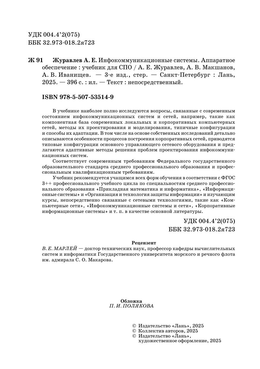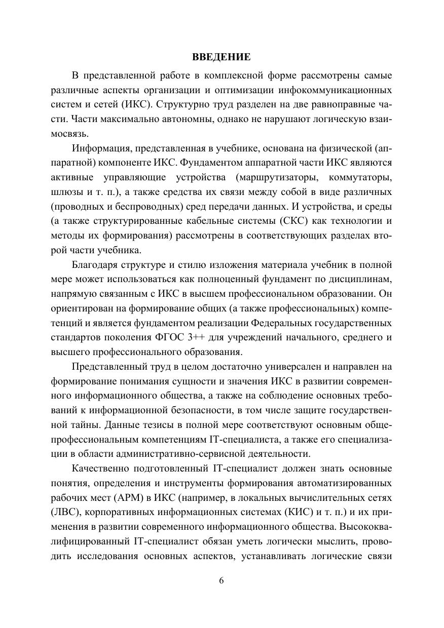 В учебнике наиболее полно исследуются вопросы, связанные с современным состоянием инфокоммуникационных систем и сетей, например, такие как компонентная база современных локальных и корпоративных компьютерных сетей, методы их проектирования и моделирования, типичные конфигурации и способы их адаптации. В том числе на основе собственных исследований детально описываются особенности процессов построения корпоративных сетей, приводятся типовые конфигурации основного управляющего сетевого оборудования и предлагаются адаптивные методы решения проблем проектирования инфокоммуникационных систем. Учебник рекомендуется учащимся всех форм обучения в соответствии с ФГОС 3++ профессионального учебного цикла по специальностям среднего профессионального образования «Прикладная математика и информатика», «Информационные системы» и «Организация и технология защиты информации» и изучающих курсы, непосредственно связанные с сетевыми технологиями, такие как «Компьютерные сети», «Инфокоммуникационные системы и сети», «Корпоративные информационные системы» и т. п. в качестве основной литературы.