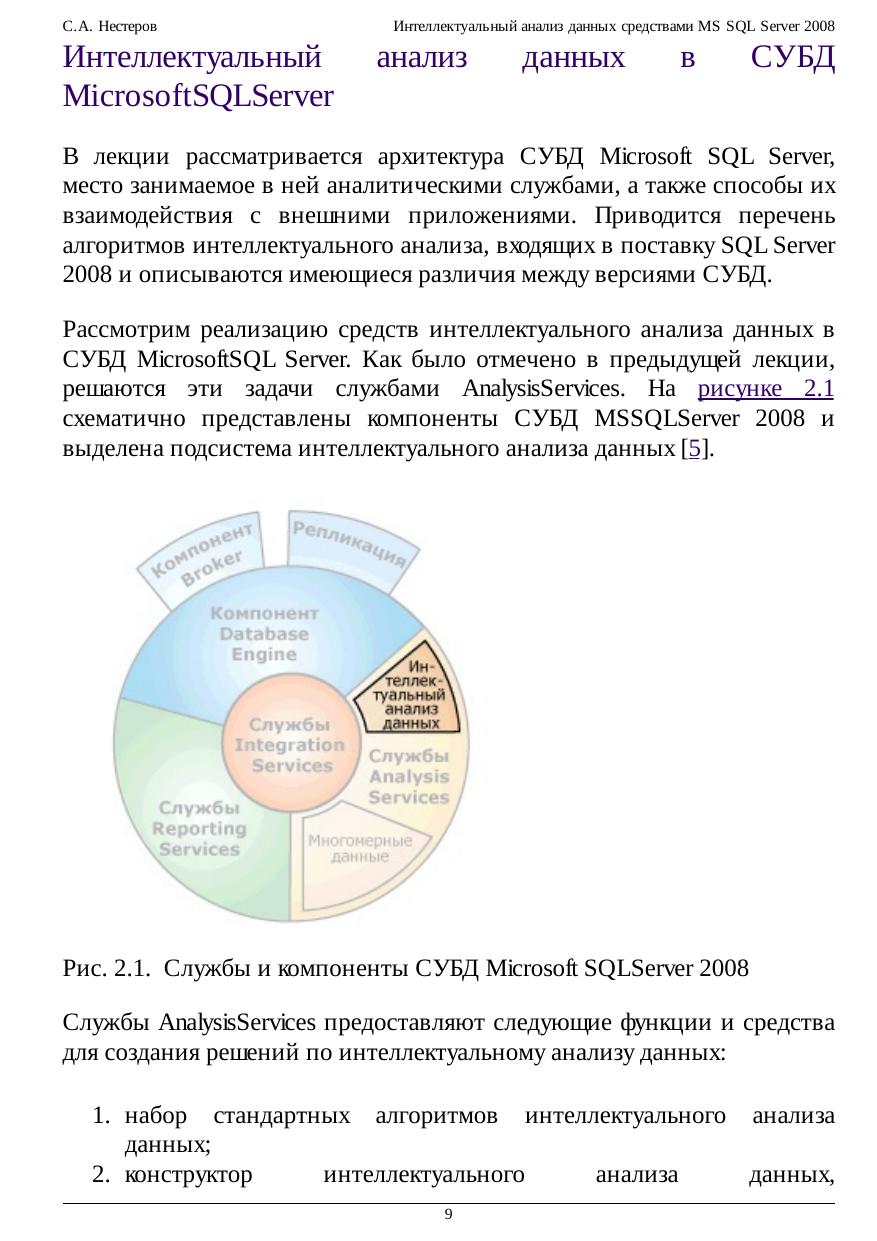 продуктах. Рассматриваются все алгоритмы DM, поддерживаемые Microsoft SQL Server 2008, надстройки интеллектуального анализа данных для Microsoft Office, основы языка DMX.