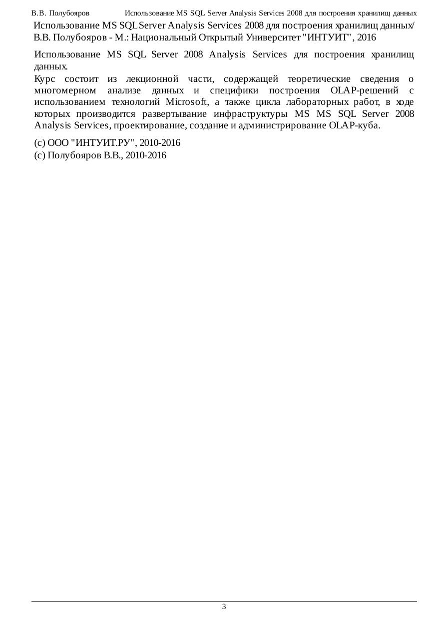 Использование MS SQL Server 2008 Analysis Services для построения хранилищ данных. Курс состоит из лекционной части, содержащей теоретические сведения о многомерном анализе данных и специфики построения OLAP-решений с использованием технологий Microsoft, а также цикла лабораторных работ, в ходе которых производится развертывание инфраструктуры MS MS SQL Server 2008