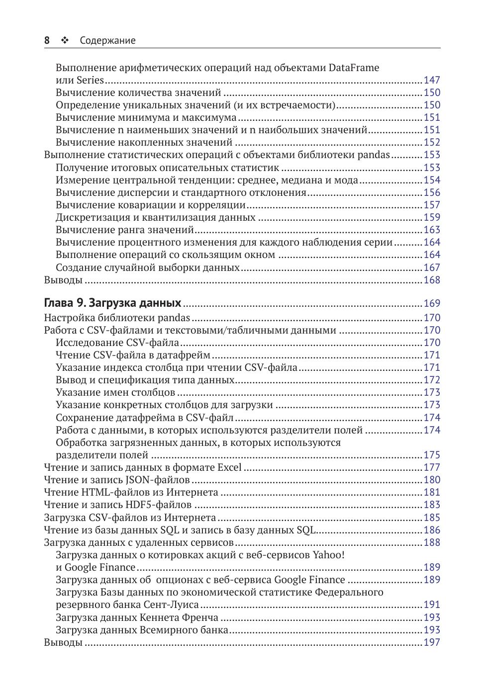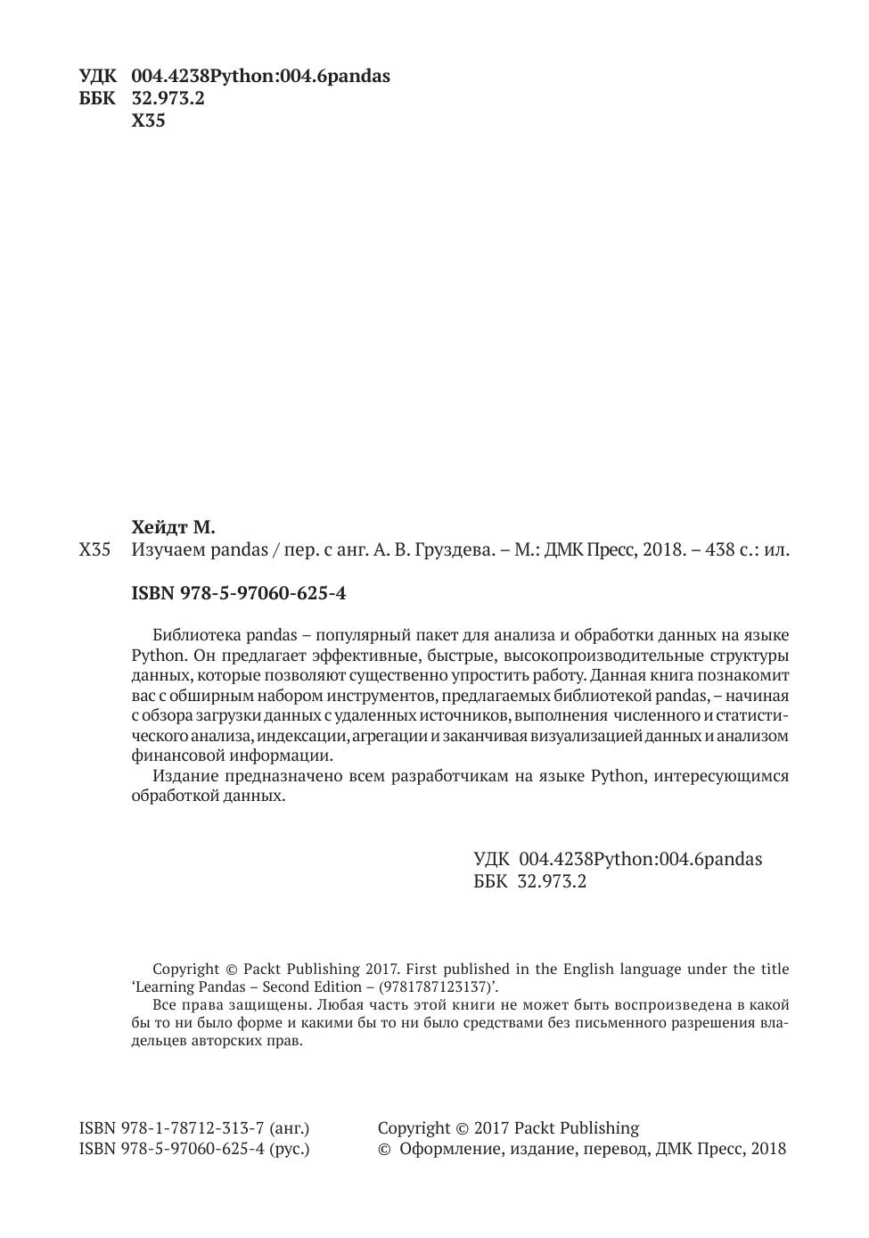 Библиотека pandas – популярный пакет для анализа и обработки данных на языке Python. Он предлагает эффективные, быстрые, высокопроизводительные структуры данных, которые позволяют существенно упростить работу. Данная книга познакомит вас с обширным набором инструментов, предлагаемых библиотекой pandas, – начиная с обзора загрузки данных с удаленных источников, выполнения численного и статистического анализа, индексации, агрегации и заканчивая визуализацией данных и анализом финансовой информации. Издание предназначено всем разработчикам на языке Python, интересующимся обработкой данных.