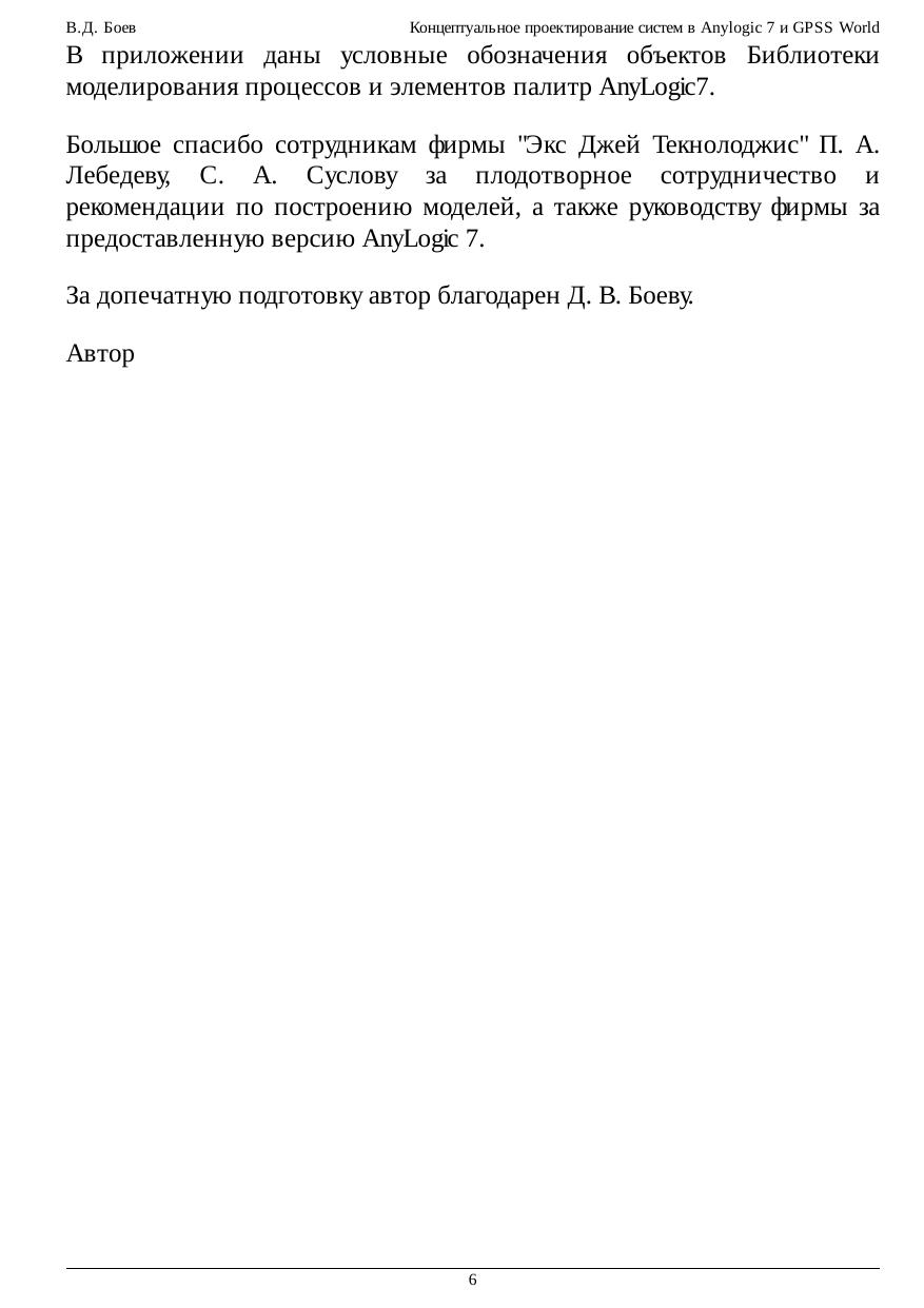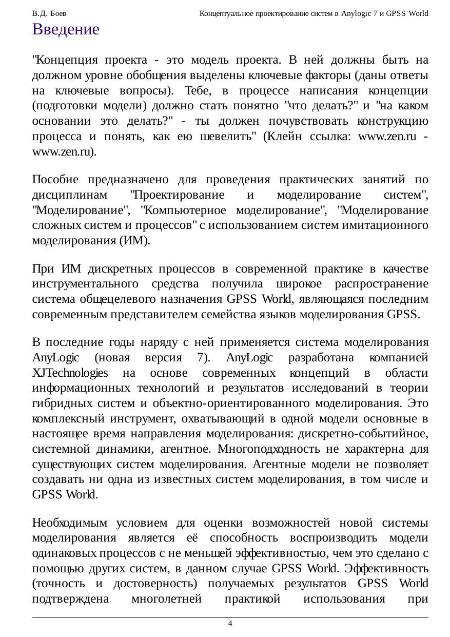 Курс предназначен для проведения практических занятий по дисциплинам, связанным с проектированием и компьютерным моделированием систем с использованием систем имитационного моделирования. Предлагаются различные методики разработки имитационных моделей с применением инструментальных средств AnyLogic 7 и GPSS World.
