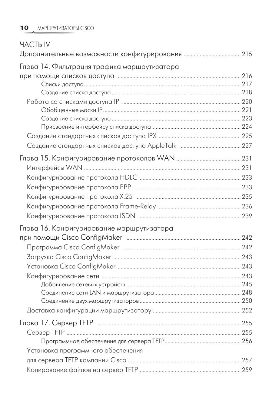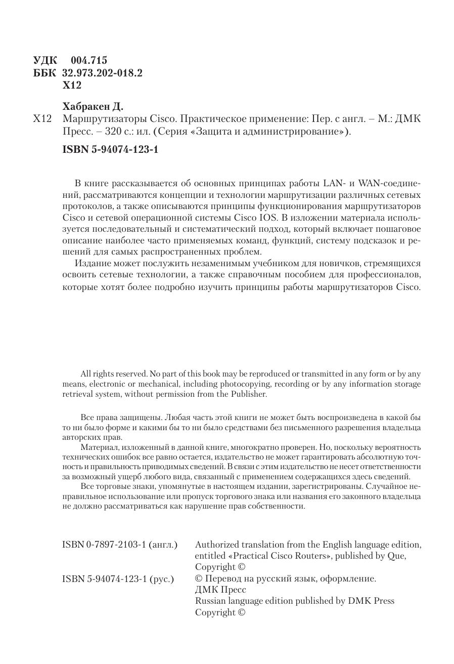 В книге рассказывается об основных принципах работы LAN- и WAN-соединений, рассматриваются концепции и технологии маршрутизации различных сетевых протоколов, а также описываются принципы функционирования маршрутизаторов Cisco и сетевой операционной системы Cisco IOS. В изложении материала используется последовательный и систематический подход, который включает пошаговое описание наиболее часто применяемых команд, функций, систему подсказок и решений для самых распространенных проблем. Издание может послужить незаменимым учебником для новичков, стремящихся освоить сетевые технологии, а также справочным пособием для профессионалов, которые хотят более подробно изучить принципы работы маршрутизаторов Cisco.