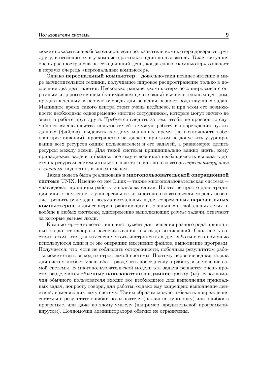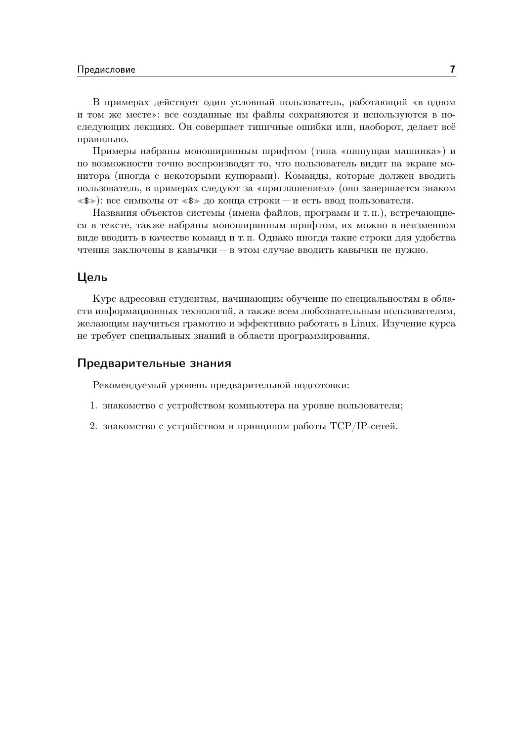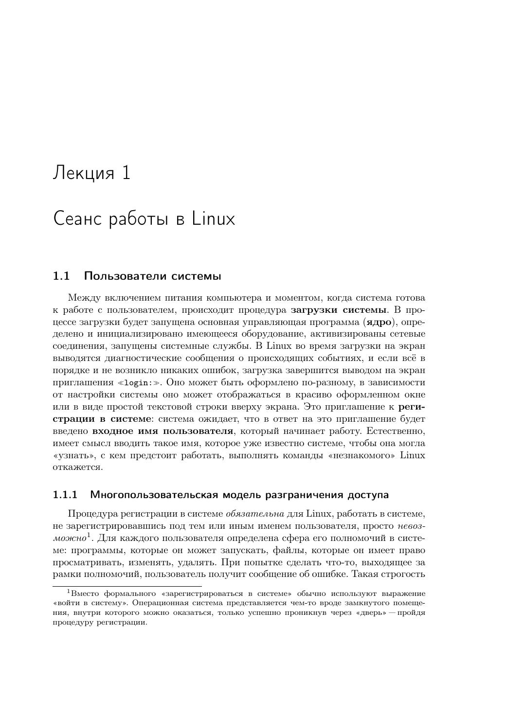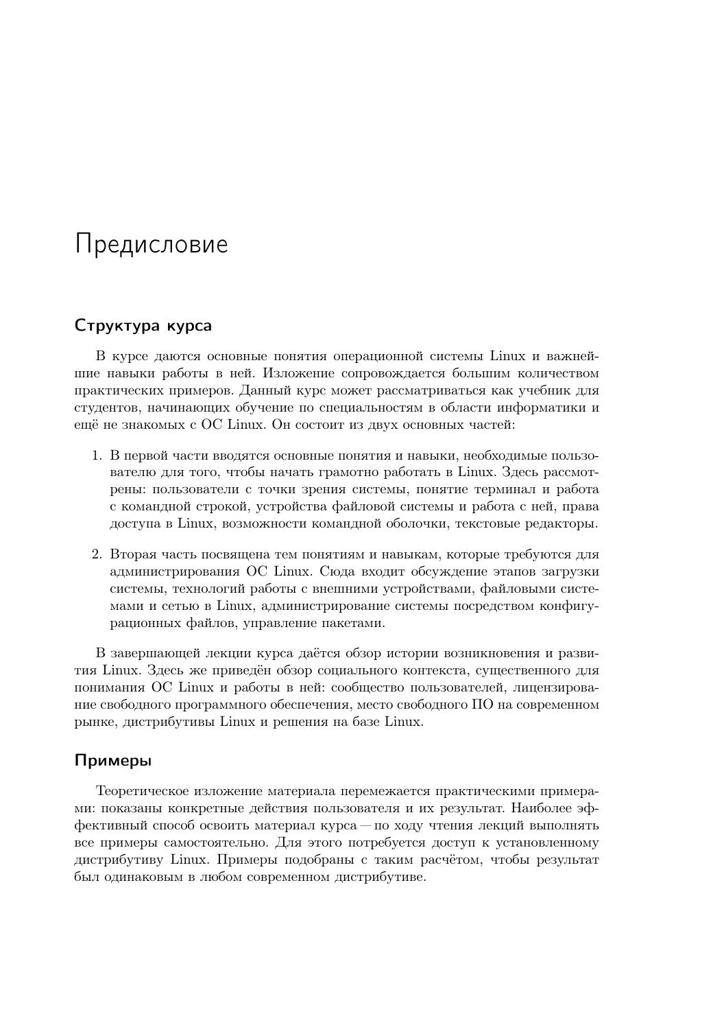В курсе даются основные понятия операционной системы Linux и важнейшие навыки работы в ней. Изложение сопровождается большим количеством практических примеров. Данный курс может рассматриваться как учебник для студентов, начинающих обучение по специальностям в области информатики и ещё не знакомых с ОС Linux. Книга адресована студентам, начинающим обучение по специальностям в области информационных технологий, а также всем любознательным пользователям, желающим научиться грамотно и эффективно работать в Linux.